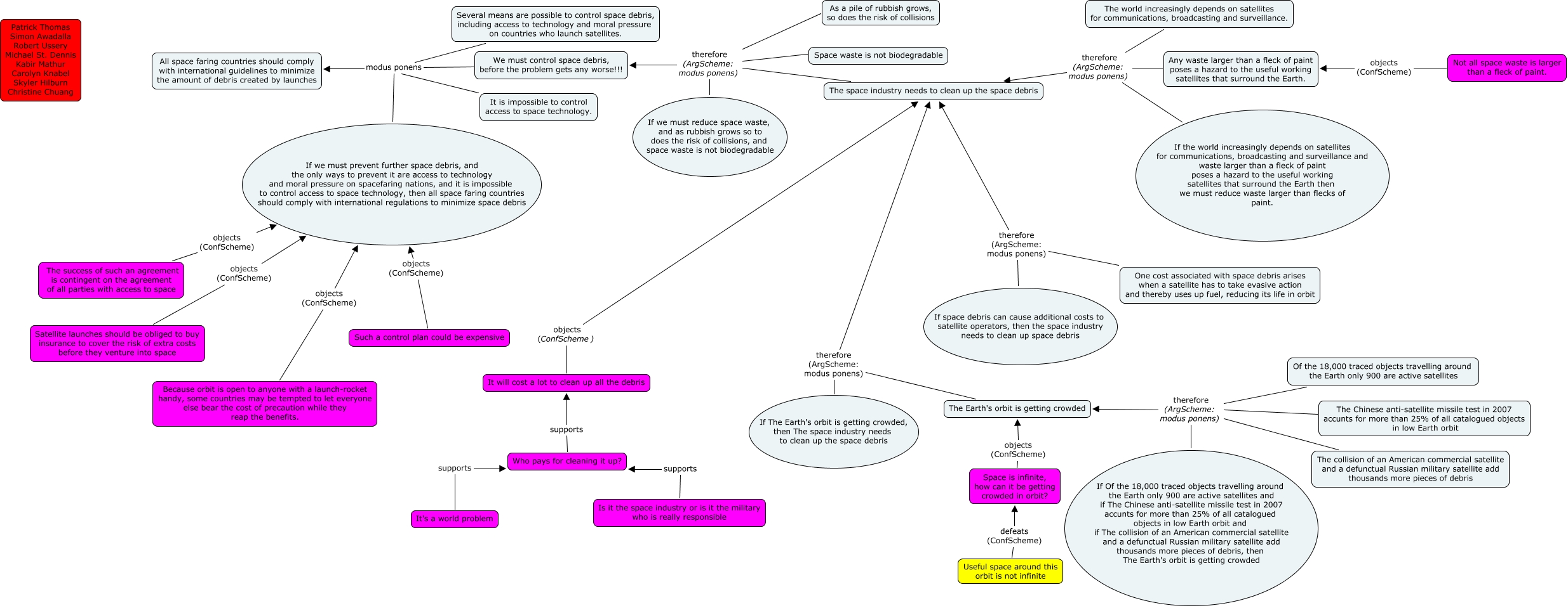 This Concept Map, created with IHMC CmapTools, has information related to: Space Debris Final, If we must reduce space waste, and as rubbish grows so to does the risk of collisions, and space waste is not biodegradable therefore (ArgScheme: modus ponens) We must control space debris, before the problem gets any worse!!!, The space industry needs to clean up the space debris therefore (ArgScheme: modus ponens) We must control space debris, before the problem gets any worse!!!, The Earth's orbit is getting crowded therefore (ArgScheme: modus ponens) If The Earth's orbit is getting crowded, then The space industry needs to clean up the space debris, One cost associated with space debris arises when a satellite has to take evasive action and thereby uses up fuel, reducing its life in orbit therefore (ArgScheme: modus ponens) The space industry needs to clean up the space debris, It is impossible to control access to space technology. modus ponens All space faring countries should comply with international guidelines to minimize the amount of debris created by launches, If space debris can cause additional costs to satellite operators, then the space industry needs to clean up space debris therefore (ArgScheme: modus ponens) The space industry needs to clean up the space debris, Not all space waste is larger than a fleck of paint. objects (ConfScheme) Any waste larger than a fleck of paint poses a hazard to the useful working satellites that surround the Earth., Any waste larger than a fleck of paint poses a hazard to the useful working satellites that surround the Earth. therefore (ArgScheme: modus ponens) The space industry needs to clean up the space debris, If Of the 18,000 traced objects travelling around the Earth only 900 are active satellites and if The Chinese anti-satellite missile test in 2007 accunts for more than 25% of all catalogued objects in low Earth orbit and if The collision of an American commercial satellite and a defunctual Russian military satellite add thousands more pieces of debris, then The Earth's orbit is getting crowded therefore (ArgScheme: modus ponens) The Earth's orbit is getting crowded, The collision of an American commercial satellite and a defunctual Russian military satellite add thousands more pieces of debris therefore (ArgScheme: modus ponens) The Earth's orbit is getting crowded, We must control space debris, before the problem gets any worse!!! modus ponens All space faring countries should comply with international guidelines to minimize the amount of debris created by launches, As a pile of rubbish grows, so does the risk of collisions therefore (ArgScheme: modus ponens) We must control space debris, before the problem gets any worse!!!, It's a world problem supports Who pays for cleaning it up?, The Earth's orbit is getting crowded therefore (ArgScheme: modus ponens) The space industry needs to clean up the space debris, Because orbit is open to anyone with a launch-rocket handy, some countries may be tempted to let everyone else bear the cost of precaution while they reap the benefits. objects (ConfScheme) If we must prevent further space debris, and the only ways to prevent it are access to technology and moral pressure on spacefaring nations, and it is impossible to control access to space technology, then all space faring countries should comply with international regulations to minimize space debris, The success of such an agreement is contingent on the agreement of all parties with access to space objects (ConfScheme) If we must prevent further space debris, and the only ways to prevent it are access to technology and moral pressure on spacefaring nations, and it is impossible to control access to space technology, then all space faring countries should comply with international regulations to minimize space debris, Such a control plan could be expensive objects (ConfScheme) If we must prevent further space debris, and the only ways to prevent it are access to technology and moral pressure on spacefaring nations, and it is impossible to control access to space technology, then all space faring countries should comply with international regulations to minimize space debris, If we must prevent further space debris, and the only ways to prevent it are access to technology and moral pressure on spacefaring nations, and it is impossible to control access to space technology, then all space faring countries should comply with international regulations to minimize space debris modus ponens All space faring countries should comply with international guidelines to minimize the amount of debris created by launches, Space waste is not biodegradable therefore (ArgScheme: modus ponens) We must control space debris, before the problem gets any worse!!!, Satellite launches should be obliged to buy insurance to cover the risk of extra costs before they venture into space objects (ConfScheme) If we must prevent further space debris, and the only ways to prevent it are access to technology and moral pressure on spacefaring nations, and it is impossible to control access to space technology, then all space faring countries should comply with international regulations to minimize space debris