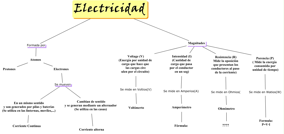 Este mapa conceptual tiene información relacionada a: María, Intensidad (I) (Cantidad de carga que pasa por el conductor en un seg) Se mide en Amperios(A) Amperímetro, Electrones Se mueven Cambian de sentido y se generan mediante un alternador (Se utiliza en las casas), Amperímetro ???? Fórmula:, Atomos ???? Electrones, Electricidad Formada por Atomos, Electricidad ???? Magnitudes, Magnitudes ???? Intensidad (I) (Cantidad de carga que pasa por el conductor en un seg), Magnitudes ???? Resistencia (R) Mide la oposición que presentan los conductores al paso de la corriente), Porencia (P) ( Mide la energía consumida por unidad de tiempo) Se mide en Watios(W) Formula: P=V·I, Ohmímetro ???? ????, Magnitudes ???? Porencia (P) ( Mide la energía consumida por unidad de tiempo), Atomos ???? Protones, En un mismo sentido y son generados por pilas y baterías (Se utiliza en las linternas, moviles,...) ???? Corriente Continua, Electrones Se mueven En un mismo sentido y son generados por pilas y baterías (Se utiliza en las linternas, moviles,...), Voltage (V) (Energía por unidad de carga que hace que las cargas circ ulen por el circuito) Se mide en Voltios(V) Voltímerto, Cambian de sentido y se generan mediante un alternador (Se utiliza en las casas) ???? Corriente alterna, Resistencia (R) Mide la oposición que presentan los conductores al paso de la corriente) Se mide en Ohmios( Ohmímetro, Magnitudes ???? Voltage (V) (Energía por unidad de carga que hace que las cargas circ ulen por el circuito)