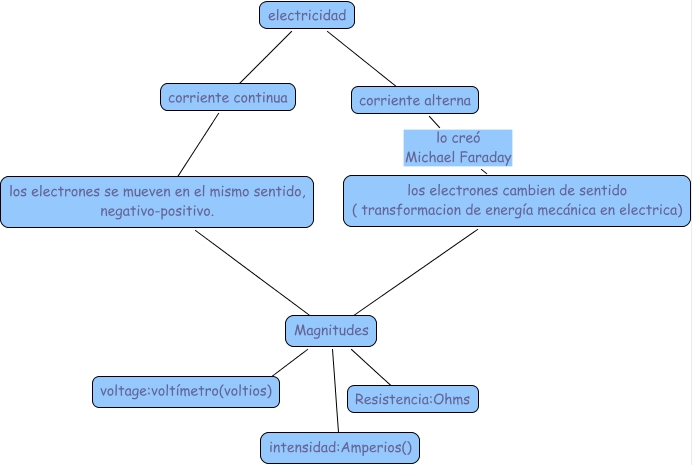 Este mapa conceptual tiene información relacionada a: Mónica, Magnitudes ???? <math xmlns="http://www.w3.org/1998/Math/MathML"> <mtext> Resistencia:Ohms </mtext> </math>, electricidad formula corriente continua, corriente continua ???? los electrones se mueven en el mismo sentido, negativo-positivo., Magnitudes ???? intensidad:Amperios(), los electrones se mueven en el mismo sentido, negativo-positivo. ???? Magnitudes, electricidad formula corriente alterna, corriente alterna lo creó Michael Faraday los electrones cambien de sentido ( transformacion de energía mecánica en electrica), Magnitudes ???? voltage:voltímetro(voltios), los electrones cambien de sentido ( transformacion de energía mecánica en electrica) ???? Magnitudes