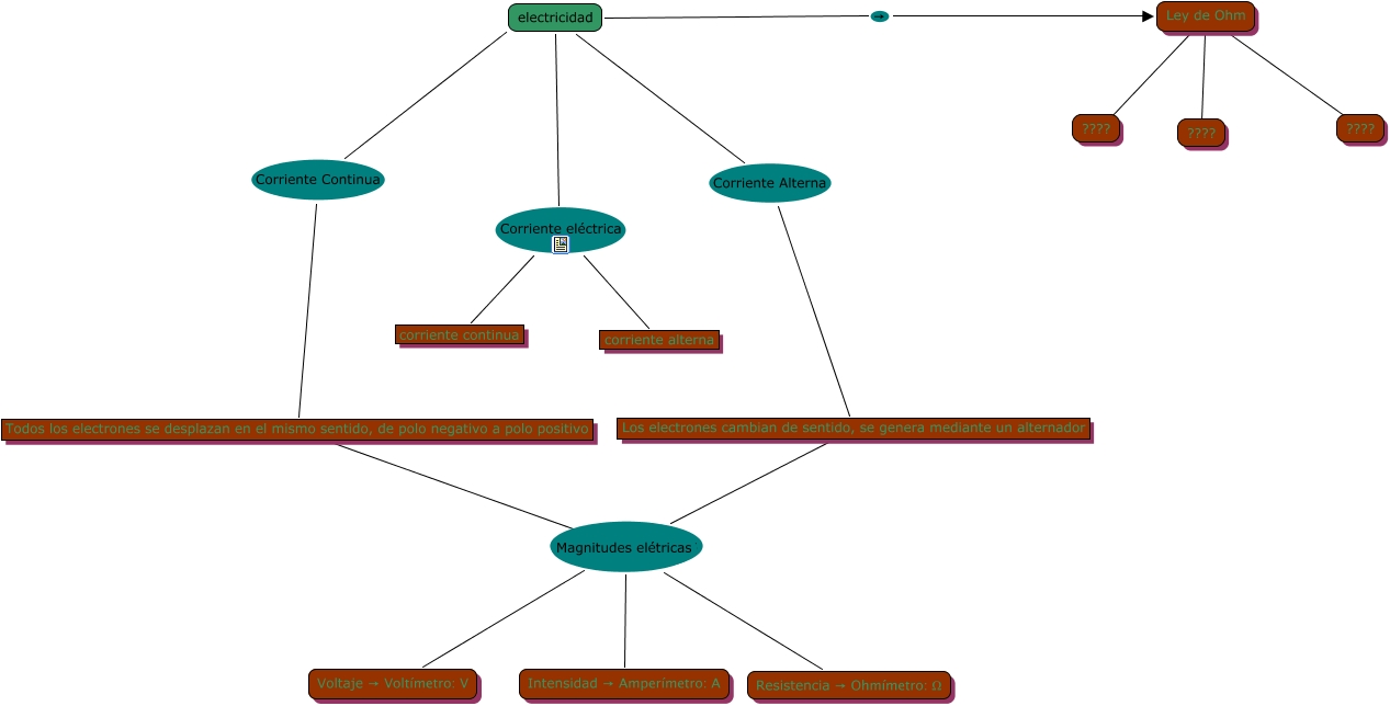 Este mapa conceptual tiene información relacionada a: salvador guaPo, electricidad Corriente eléctrica corriente continua, electricidad Corriente Alterna Los electrones cambian de sentido, se genera mediante un alternador, electricidad Corriente Continua Todos los electrones se desplazan en el mismo sentido, de polo negativo a polo positivo, Los electrones cambian de sentido, se genera mediante un alternador Magnitudes eléctricas Intensidad → Amperímetro: A, electricidad Corriente eléctrica corriente alterna, Todos los electrones se desplazan en el mismo sentido, de polo negativo a polo positivo Magnitudes elétricas Resistencia → Ohmímetro: Ω, Ley de Ohm ???? ????, Ley de Ohm ???? ????, Los electrones cambian de sentido, se genera mediante un alternador Magnitudes eléctricas Voltaje → Voltímetro: V, electricidad → Ley de Ohm, Ley de Ohm ???? ????