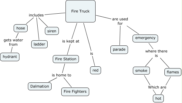 This Concept Map, created with IHMC CmapTools, has information related to: Fire Truck, emergency where there is smoke, hose gets water from hydrant, flames hot, smoke Which are hot, Fire Truck is kept at Fire Station, Fire Truck is red, Fire Truck are used for parade, Fire Station is home to Fire Fighters, emergency where there is flames, Fire Truck includes hose, Fire Truck includes siren, Fire Truck includes ladder, Fire Truck are used for emergency, Fire Station is home to Dalmation