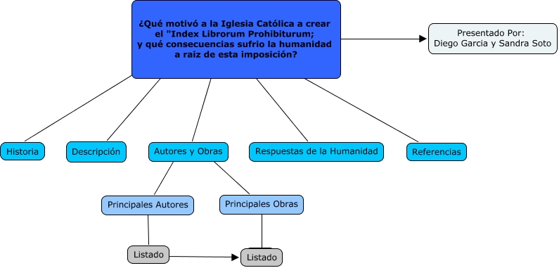 Este Cmap, tiene información relacionada con: Primera Entrega, ¿Qué motivó a la Iglesia Católica a crear el "Index Librorum Prohibiturum; y qué consecuencias sufrio la humanidad a raiz de esta imposición? ???? Historia, Autores y Obras ???? Principales Obras, ¿Qué motivó a la Iglesia Católica a crear el "Index Librorum Prohibiturum; y qué consecuencias sufrio la humanidad a raiz de esta imposición? ???? Descripción, ¿Qué motivó a la Iglesia Católica a crear el "Index Librorum Prohibiturum; y qué consecuencias sufrio la humanidad a raiz de esta imposición? ???? Respuestas de la Humanidad, Listado ???? Listado, Principales Obras ???? Listado, Principales Autores ???? Listado, ¿Qué motivó a la Iglesia Católica a crear el "Index Librorum Prohibiturum; y qué consecuencias sufrio la humanidad a raiz de esta imposición? ???? Referencias, ¿Qué motivó a la Iglesia Católica a crear el "Index Librorum Prohibiturum; y qué consecuencias sufrio la humanidad a raiz de esta imposición? ???? Autores y Obras, ¿Qué motivó a la Iglesia Católica a crear el "Index Librorum Prohibiturum; y qué consecuencias sufrio la humanidad a raiz de esta imposición? ???? Presentado Por: Diego Garcia y Sandra Soto, Autores y Obras ???? Principales Autores