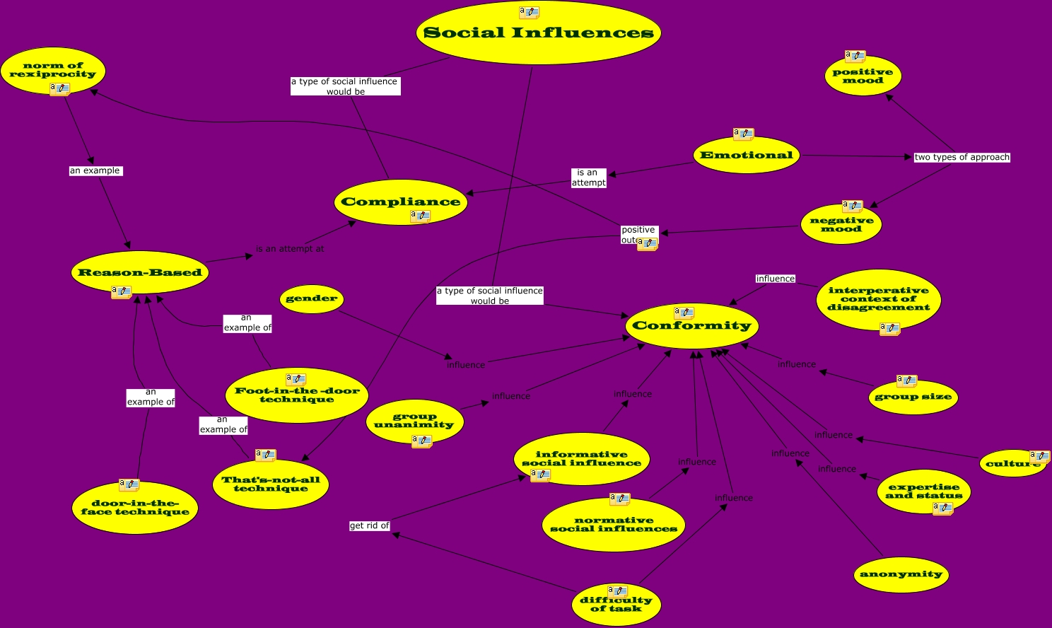 This Concept Map, created with IHMC CmapTools, has information related to: Social Influences, informative social influence influence Conformity, normative social influences influence Conformity, Social Influences a type of social influence would be Conformity, That's-not-all technique an example of Reason-Based, Social Influences a type of social influence would be Compliance, Emotional is an attempt Compliance, norm of rexiprocity an example Reason-Based, group unanimity influence Conformity, difficulty of task get rid of informative social influence, Reason-Based is an attempt at Compliance, Foot-in-the -door technique an example of Reason-Based, difficulty of task influence Conformity, negative mood positive outcome norm of rexiprocity, door-in-the- face technique an example of Reason-Based, culture influence Conformity, group size influence Conformity, anonymity influence Conformity, expertise and status influence Conformity, interperative context of disagreement influence Conformity, negative mood positive outcome That's-not-all technique