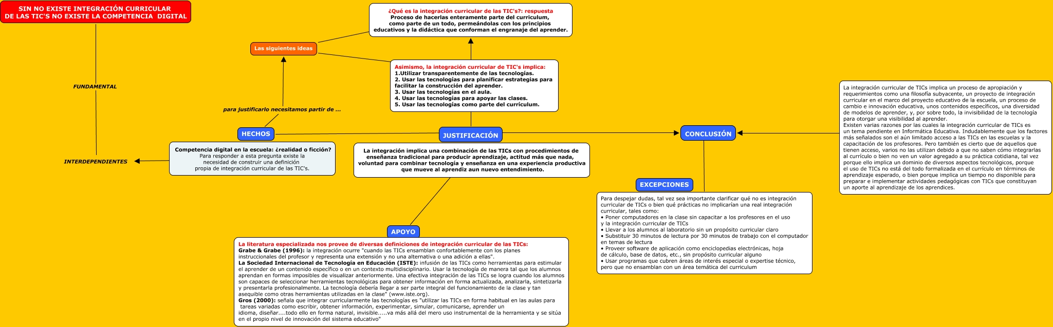 Este Cmap, tiene información relacionada con: Competencia digital y transversalidad_Hernández_Martín_Rafael, HECHOS para justificarlo necesitamos partir de ... Las siguientes ideas, JUSTIFICACIÓN ???? ¿Qué es la integración curricular de las TIC's?: respuesta Proceso de hacerlas enteramente parte del curriculum, como parte de un todo, permeándolas con los principios educativos y la didáctica que conforman el engranaje del aprender., Las siguientes ideas ???? ¿Qué es la integración curricular de las TIC's?: respuesta Proceso de hacerlas enteramente parte del curriculum, como parte de un todo, permeándolas con los principios educativos y la didáctica que conforman el engranaje del aprender., HECHOS ???? CONCLUSIÓN, Para despejar dudas, tal vez sea importante clarificar qué no es integración curricular de TICs o bien qué prácticas no implicarían una real integración curricular, tales como: • Poner computadores en la clase sin capacitar a los profesores en el uso y la integración curricular de TICs • Llevar a los alumnos al laboratorio sin un propósito curricular claro • Substituir 30 minutos de lectura por 30 minutos de trabajo con el computador en temas de lectura • Proveer software de aplicación como enciclopedias electrónicas, hoja de cálculo, base de datos, etc., sin propósito curricular alguno • Usar programas que cubren áreas de interés especial o expertise técnico, pero que no ensamblan con un área temática del curriculum ???? CONCLUSIÓN, APOYO ???? La integración implica una combinación de las TICs con procedimientos de enseñanza tradicional para producir aprendizaje, actitud más que nada, voluntad para combinar tecnología y enseñanza en una experiencia productiva que mueve al aprendiz aun nuevo entendimiento., La literatura especializada nos provee de diversas definiciones de integración curricular de las TICs: Grabe & Grabe (1996): la integración ocurre "cuando las TICs ensamblan confortablemente con los planes instruccionales del profesor y representa una extensión y no una alternativa o una adición a ellas". La Sociedad Internacional de Tecnología en Educación (ISTE): infusión de las TICs como herramientas para estimular el aprender de un contenido específico o en un contexto multidisciplinario. Usar la tecnología de manera tal que los alumnos aprendan en formas imposibles de visualizar anteriormente. Una efectiva integración de las TICs se logra cuando los alumnos son capaces de seleccionar herramientas tecnológicas para obtener información en forma actualizada, analizarla, sintetizarla y presentarla profesionalmente. La tecnología debería llegar a ser parte integral del funcionamiento de la clase y tan asequible como otras herramientas utilizadas en la clase" (www.iste.org). Gros (2000): señala que integrar curricularmente las tecnologías es "utilizar las TICs en forma habitual en las aulas para tareas variadas como escribir, obtener información, experimentar, simular, comunicarse, aprender un idioma, diseñar....todo ello en forma natural, invisible.....va más allá del mero uso instrumental de la herramienta y se sitúa en el propio nivel de innovación del sistema educativo" ???? APOYO, SIN NO EXISTE INTEGRACIÓN CURRICULAR DE LAS TIC'S NO EXISTE LA COMPETENCIA DIGITAL FUNDAMENTAL INTERDEPENDIENTES, Competencia digital en la escuela: ¿realidad o ficción? Para responder a esta pregunta existe la necesidad de construir una definición propia de integración curricular de las TIC's. ???? INTERDEPENDIENTES, La integración curricular de TICs implica un proceso de apropiación y requerimientos como una filosofía subyacente, un proyecto de integración curricular en el marco del proyecto educativo de la escuela, un proceso de cambio e innovación educativa, unos contenidos específicos, una diversidad de modelos de aprender, y, por sobre todo, la invisibilidad de la tecnología para otorgar una visibilidad al aprender. Existen varias razones por las cuales la integración curricular de TICs es un tema pendiente en Informática Educativa. Indudablemente que los factores más señalados son el aún limitado acceso a las TICs en las escuelas y la capacitación de los profesores. Pero también es cierto que de aquellos que tienen acceso, varios no las utilizan debido a que no saben cómo integrarlas al currículo o bien no ven un valor agregado a su práctica cotidiana, tal vez porque ello implica un dominio de diversos aspectos tecnológicos, porque el uso de TICs no está del todo formalizada en el currículo en términos de aprendizaje esperado, o bien porque implica un tiempo no disponible para preparar e implementar actividades pedagógicas con TICs que constituyan un aporte al aprendizaje de los aprendices. ???? CONCLUSIÓN, Las siguientes ideas ???? Asimismo, la integración curricular de TIC's implica: 1.Utilizar transparentemente de las tecnologías. 2. Usar las tecnologías para planificar estrategias para facilitar la construcción del aprender. 3. Usar las tecnologías en el aula. 4. Usar las tecnologías para apoyar las clases. 5. Usar las tecnologías como parte del currículum.