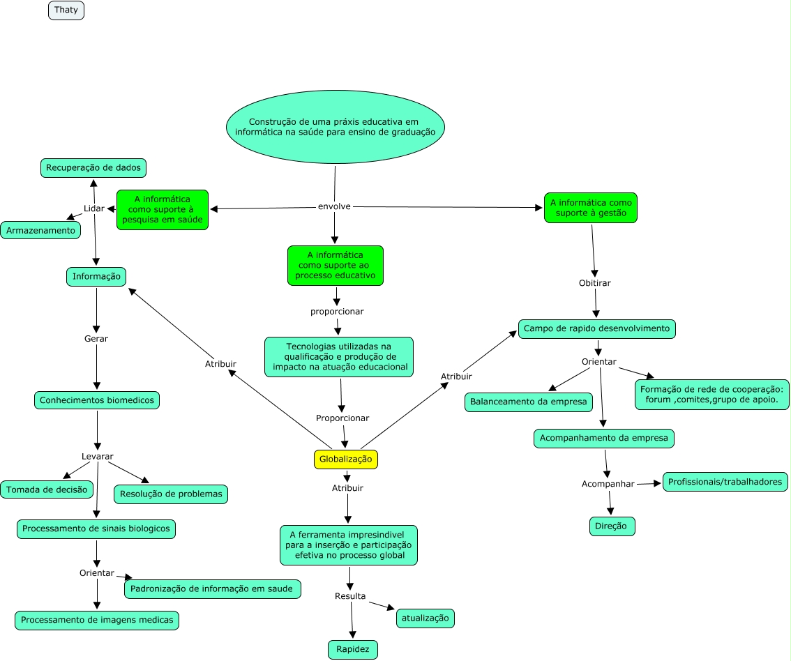 thatany Loures, Campo de rapido desenvolvimento Orientar Balanceamento da empresa, A informática como suporte à pesquisa em saúde Lidar Informação, Conhecimentos biomedicos Levarar Resolução de problemas, Campo de rapido desenvolvimento Orientar Formação de rede de cooperação: forum ,comites,grupo de apoio., Globalização Atribuir Informação, A informática como suporte à gestão Obitirar Campo de rapido desenvolvimento, Tecnologias utilizadas na qualificação e produção de impacto na atuação educacional Proporcionar Globalização, Acompanhamento da empresa Acompanhar Direção, A informática como suporte ao processo educativo proporcionar Tecnologias utilizadas na qualificação e produção de impacto na atuação educacional, Conhecimentos biomedicos Levarar Tomada de decisão