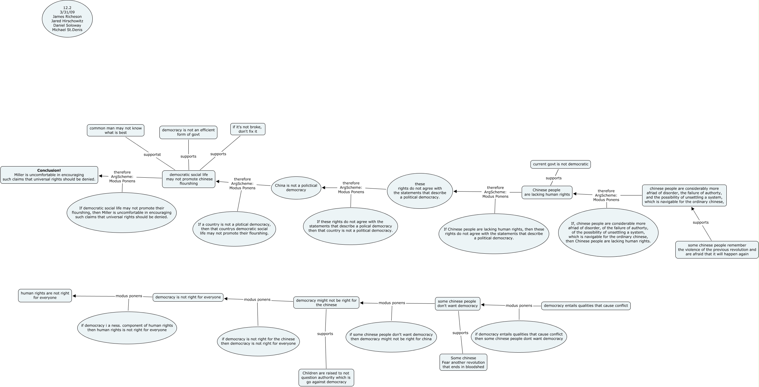 This Concept Map, created with IHMC CmapTools, has information related to: Group 8 - 12.2, democracy is not right for everyone modus ponens human rights are not right for everyone, China is not a polictical democracy therefore ArgScheme: Modus Ponens If a country is not a plotical democracy, then that countrys democratic social life may not promote their flourshing., chinese people are considerably more afriad of disorder, the failure of authorty, and the possibility of unsettling a system, which is navigable for the ordinary chinese, therefore ArgScheme: Modus Ponens Chinese people are lacking human rights, democratic social life may not promote chinese flourshing therefore ArgScheme: Modus Ponens If democratic social life may not promote their flourshing, then Miller is uncomfortable in encouraging such claims that universal rights should be denied., Chinese people are lacking human rights therefore ArgScheme: Modus Ponens these rights do not agree with the statements that describe a political democracy., democratic social life may not promote chinese flourshing therefore ArgScheme: Modus Ponens Conclusion! Miller is uncomfortable in encouraging such claims that universal rights should be denied., if democracy is not right for the chinese then democracy is not right for everyone modus ponens democracy is not right for everyone, these rights do not agree with the statements that describe a political democracy. therefore ArgScheme: Modus Ponens If these rights do not agree with the statements that describe a polical democracy then that country is not a political democracy., common man may not know what is best supportst democratic social life may not promote chinese flourshing, current govt is not democratic supports Chinese people are lacking human rights, democracy might not be right for the chinese supports Children are raised to not question authority which is go against democracy, democracy might not be right for the chinese modus ponens democracy is not right for everyone, Chinese people are lacking human rights therefore ArgScheme: Modus Ponens If Chinese people are lacking human rights, then these rights do not agree with the statements that describe a political democracy., if democracy entails qualities that cause conflict then some chinese people dont want democracy modus ponens some chinese people don't want democracy, China is not a polictical democracy therefore ArgScheme: Modus Ponens democratic social life may not promote chinese flourshing, democracy is not an efficient form of govt supports democratic social life may not promote chinese flourshing, some chinese people don't want democracy supports Some chinese Fear another revolution that ends in bloodshed, if it's not broke, don't fix it supports democratic social life may not promote chinese flourshing, chinese people are considerably more afriad of disorder, the failure of authorty, and the possibility of unsettling a system, which is navigable for the ordinary chinese, therefore ArgScheme: Modus Ponens If, chinese people are considerable more afriad of disorder, of the failure of authorty, of the possibility of unsettling a system, which is navigable for the ordinary chinese, then Chinese people are lacking human rights., if democracy i a ness. component of human rights then human rights is not right for everyone modus ponens human rights are not right for everyone