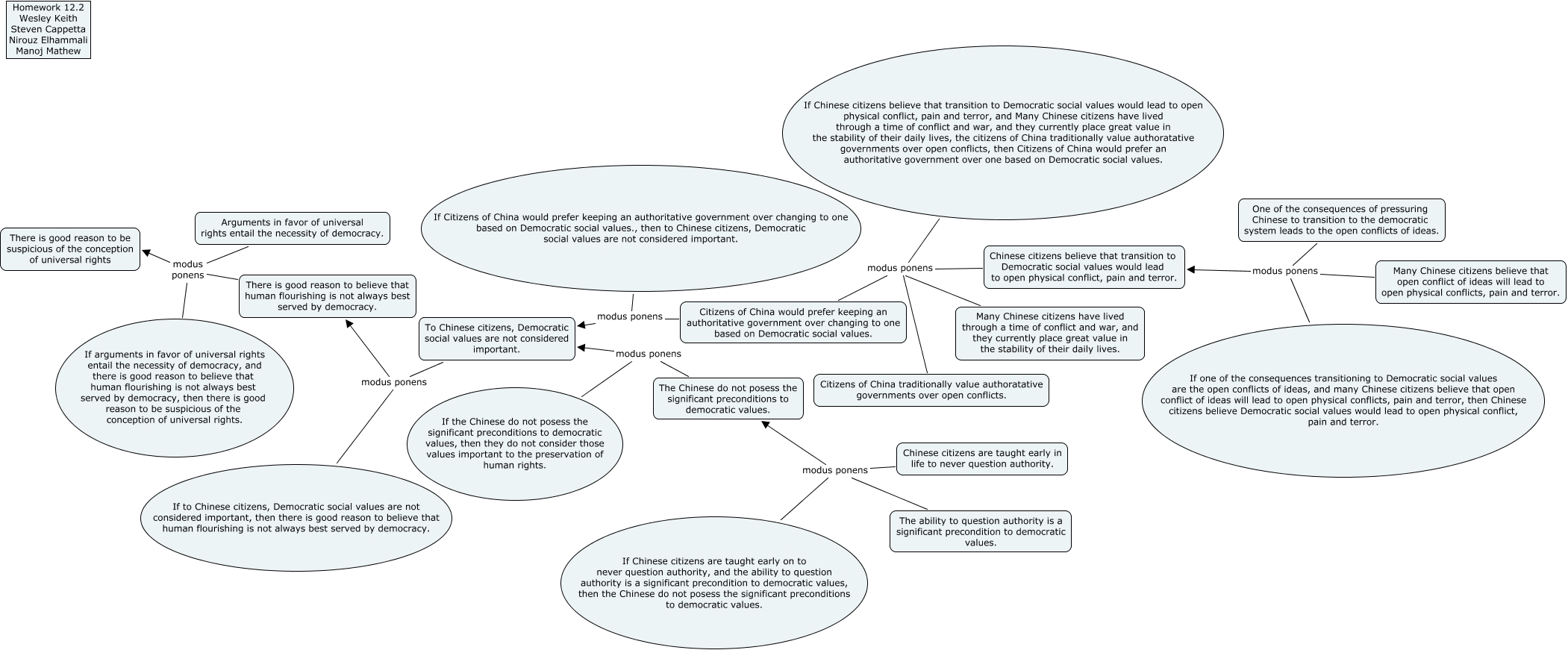 This Concept Map, created with IHMC CmapTools, has information related to: Group 4 - 12.2, If to Chinese citizens, Democratic social values are not considered important, then there is good reason to believe that human flourishing is not always best served by democracy. modus ponens There is good reason to believe that human flourishing is not always best served by democracy., The Chinese do not posess the significant preconditions to democratic values. modus ponens To Chinese citizens, Democratic social values are not considered important., Arguments in favor of universal rights entail the necessity of democracy. modus ponens If arguments in favor of universal rights entail the necessity of democracy, and there is good reason to believe that human flourishing is not always best served by democracy, then there is good reason to be suspicious of the conception of universal rights., Chinese citizens are taught early in life to never question authority. modus ponens The Chinese do not posess the significant preconditions to democratic values., There is good reason to believe that human flourishing is not always best served by democracy. modus ponens If arguments in favor of universal rights entail the necessity of democracy, and there is good reason to believe that human flourishing is not always best served by democracy, then there is good reason to be suspicious of the conception of universal rights., To Chinese citizens, Democratic social values are not considered important. modus ponens There is good reason to believe that human flourishing is not always best served by democracy., If one of the consequences transitioning to Democratic social values are the open conflicts of ideas, and many Chinese citizens believe that open conflict of ideas will lead to open physical conflicts, pain and terror, then Chinese citizens believe Democratic social values would lead to open physical conflict, pain and terror. modus ponens Chinese citizens believe that transition to Democratic social values would lead to open physical conflict, pain and terror., One of the consequences of pressuring Chinese to transition to the democratic system leads to the open conflicts of ideas. modus ponens Chinese citizens believe that transition to Democratic social values would lead to open physical conflict, pain and terror., Arguments in favor of universal rights entail the necessity of democracy. modus ponens There is good reason to be suspicious of the conception of universal rights, If Chinese citizens believe that transition to Democratic social values would lead to open physical conflict, pain and terror, and Many Chinese citizens have lived through a time of conflict and war, and they currently place great value in the stability of their daily lives, the citizens of China traditionally value authoratative governments over open conflicts, then Citizens of China would prefer an authoritative government over one based on Democratic social values. modus ponens Citizens of China would prefer keeping an authoritative government over changing to one based on Democratic social values., Many Chinese citizens have lived through a time of conflict and war, and they currently place great value in the stability of their daily lives. modus ponens Citizens of China would prefer keeping an authoritative government over changing to one based on Democratic social values., Citizens of China traditionally value authoratative governments over open conflicts. modus ponens Citizens of China would prefer keeping an authoritative government over changing to one based on Democratic social values., Chinese citizens believe that transition to Democratic social values would lead to open physical conflict, pain and terror. modus ponens Citizens of China would prefer keeping an authoritative government over changing to one based on Democratic social values., If Chinese citizens are taught early on to never question authority, and the ability to question authority is a significant precondition to democratic values, then the Chinese do not posess the significant preconditions to democratic values. modus ponens The Chinese do not posess the significant preconditions to democratic values., Many Chinese citizens believe that open conflict of ideas will lead to open physical conflicts, pain and terror. modus ponens Chinese citizens believe that transition to Democratic social values would lead to open physical conflict, pain and terror., There is good reason to believe that human flourishing is not always best served by democracy. modus ponens There is good reason to be suspicious of the conception of universal rights, Citizens of China would prefer keeping an authoritative government over changing to one based on Democratic social values. modus ponens To Chinese citizens, Democratic social values are not considered important., The ability to question authority is a significant precondition to democratic values. modus ponens The Chinese do not posess the significant preconditions to democratic values., If Citizens of China would prefer keeping an authoritative government over changing to one based on Democratic social values., then to Chinese citizens, Democratic social values are not considered important. modus ponens To Chinese citizens, Democratic social values are not considered important., If the Chinese do not posess the significant preconditions to democratic values, then they do not consider those values important to the preservation of human rights. modus ponens To Chinese citizens, Democratic social values are not considered important.
