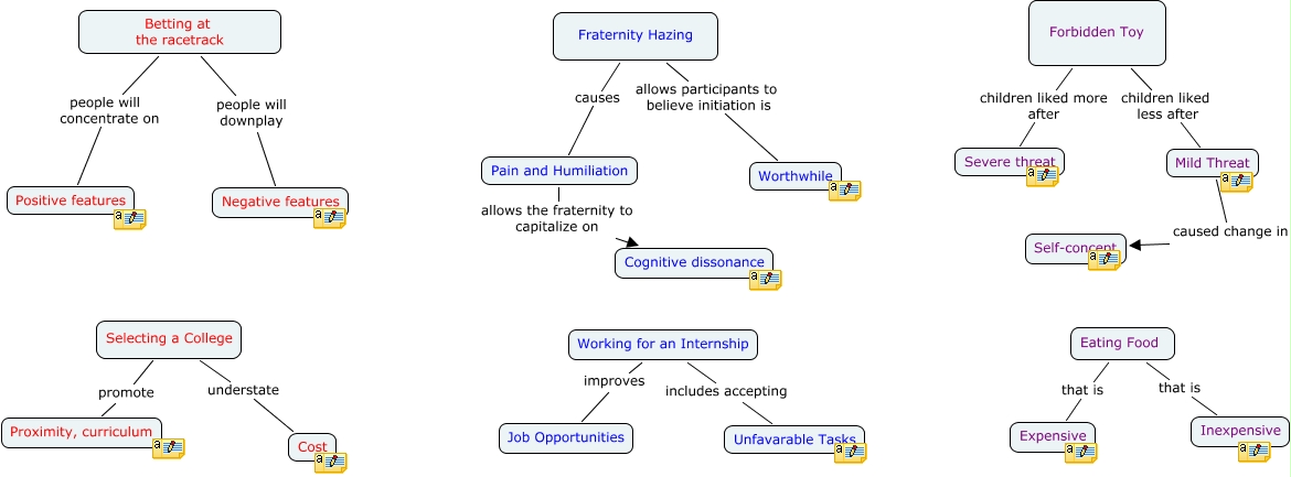 This Concept Map, created with IHMC CmapTools, has information related to: Attitudes and Behavior, Eating Food that is Expensive, Fraternity Hazing allows participants to believe initiation is Worthwhile, Eating Food that is Inexpensive, Working for an Internship includes accepting Unfavarable Tasks, Selecting a College promote Proximity, curriculum, Pain and Humiliation allows the fraternity to capitalize on Cognitive dissonance, Fraternity Hazing causes Pain and Humiliation, Betting at the racetrack people will concentrate on Positive features, Betting at the racetrack people will downplay Negative features, Working for an Internship improves Job Opportunities, Selecting a College understate Cost, Mild Threat caused change in Self-concept, Forbidden Toy children liked less after Mild Threat, Forbidden Toy children liked more after Severe threat
