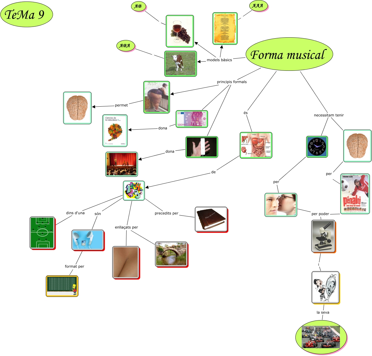 Este Cmap, tiene información relacionada con: Nou Tema 9, Forma musical models bàsics, dona, ABA, per, la seva, format per, són, permet, per poder, dins d'una, Forma musical principis formals, precedits per, i, per poder, enllaçats per, Forma musical models bàsics, Forma musical és, AB, enllaçats per, per