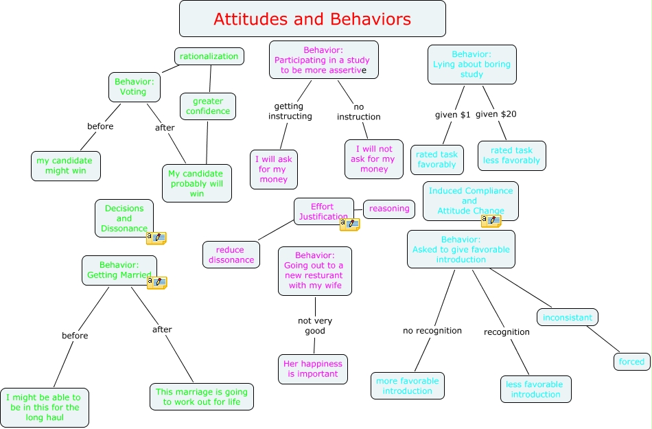 This Concept Map, created with IHMC CmapTools, has information related to: attitudes and behaviors, Behavior: Going out to a new resturant with my wife not very good Her happiness is important, Behavior: Participating in a study to be more assertive no instruction I will not ask for my money, greater confidence ???? My candidate probably will win, greater confidence ???? rationalization, forced ???? inconsistant, reduce dissonance ???? Effort Justification, inconsistant ???? Behavior: Asked to give favorable introduction, Behavior: Getting Married before I might be able to be in this for the long haul, Behavior: Voting before my candidate might win, Behavior: Lying about boring study given $20 rated task less favorably, Behavior: Lying about boring study given $1 rated task favorably, Behavior: Getting Married after This marriage is going to work out for life, Behavior: Asked to give favorable introduction no recognition more favorable introduction, reasoning ???? Effort Justification, Behavior: Voting after My candidate probably will win, Behavior: Asked to give favorable introduction recognition less favorable introduction, Behavior: Participating in a study to be more assertive getting instructing I will ask for my money, rationalization ???? Behavior: Voting