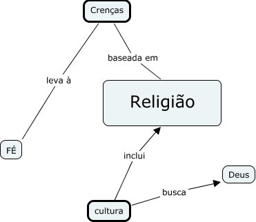 Esse mapa conceitual, produzido no IHMC CmapTools, tem a informação relacionada a: religião, cultura busca Deus, Crenças leva à FÉ, Crenças baseada em Religião, cultura inclui Religião