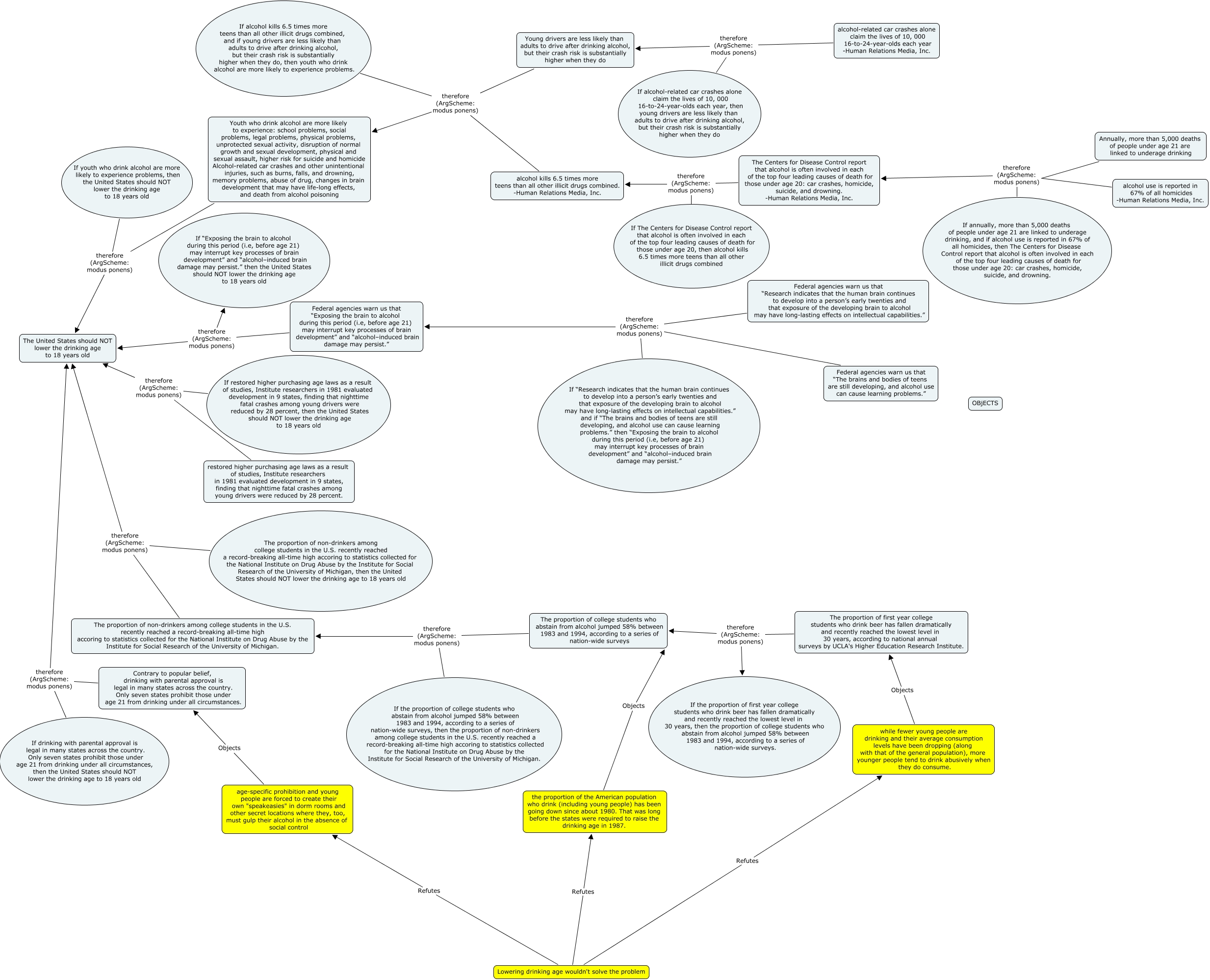 This Concept Map, created with IHMC CmapTools, has information related to: 13.1 CC, Federal agencies warn us that “Research indicates that the human brain continues to develop into a person’s early twenties and that exposure of the developing brain to alcohol may have long-lasting effects on intellectual capabilities.” therefore (ArgScheme: modus ponens) Federal agencies warn us that “The brains and bodies of teens are still developing, and alcohol use can cause learning problems.”, restored higher purchasing age laws as a result of studies, Institute researchers in 1981 evaluated development in 9 states, finding that nighttime fatal crashes among young drivers were reduced by 28 percent. therefore (ArgScheme: modus ponens) The United States should NOT lower the drinking age to 18 years old, Annually, more than 5,000 deaths of people under age 21 are linked to underage drinking therefore (ArgScheme: modus ponens) The Centers for Disease Control report that alcohol is often involved in each of the top four leading causes of death for those under age 20: car crashes, homicide, suicide, and drowning. -Human Relations Media, Inc., alcohol kills 6.5 times more teens than all other illicit drugs combined. -Human Relations Media, Inc. therefore (ArgScheme: modus ponens) If alcohol kills 6.5 times more teens than all other illicit drugs combined, and if young drivers are less likely than adults to drive after drinking alcohol, but their crash risk is substantially higher when they do, then youth who drink alcohol are more likely to experience problems., alcohol kills 6.5 times more teens than all other illicit drugs combined. -Human Relations Media, Inc. therefore (ArgScheme: modus ponens) Youth who drink alcohol are more likely to experience: school problems, social problems, legal problems, physical problems, unprotected sexual activity, disruption of normal growth and sexual development, physical and sexual assault, higher risk for suicide and homicide Alcohol-related car crashes and other unintentional injuries, such as burns, falls, and drowning, memory problems, abuse of drug, changes in brain development that may have life-long effects, and death from alcohol poisoning, Annually, more than 5,000 deaths of people under age 21 are linked to underage drinking therefore (ArgScheme: modus ponens) If annually, more than 5,000 deaths of people under age 21 are linked to underage drinking, and if alcohol use is reported in 67% of all homicides, then The Centers for Disease Control report that alcohol is often involved in each of the top four leading causes of death for those under age 20: car crashes, homicide, suicide, and drowning., The proportion of first year college students who drink beer has fallen dramatically and recently reached the lowest level in 30 years, according to national annual surveys by UCLA's Higher Education Research Institute. therefore (ArgScheme: modus ponens) The proportion of college students who abstain from alcohol jumped 58% between 1983 and 1994, according to a series of nation-wide surveys, The Centers for Disease Control report that alcohol is often involved in each of the top four leading causes of death for those under age 20: car crashes, homicide, suicide, and drowning. -Human Relations Media, Inc. therefore (ArgScheme: modus ponens) If The Centers for Disease Control report that alcohol is often involved in each of the top four leading causes of death for those under age 20, then alcohol kills 6.5 times more teens than all other illicit drugs combined, The proportion of college students who abstain from alcohol jumped 58% between 1983 and 1994, according to a series of nation-wide surveys therefore (ArgScheme: modus ponens) The proportion of non-drinkers among college students in the U.S. recently reached a record-breaking all-time high accoring to statistics collected for the National Institute on Drug Abuse by the Institute for Social Research of the University of Michigan., Contrary to popular belief, drinking with parental approval is legal in many states across the country. Only seven states prohibit those under age 21 from drinking under all circumstances. therefore (ArgScheme: modus ponens) If drinking with parental approval is legal in many states across the country. Only seven states prohibit those under age 21 from drinking under all circumstances, then the United States should NOT lower the drinking age to 18 years old, Federal agencies warn us that “Research indicates that the human brain continues to develop into a person’s early twenties and that exposure of the developing brain to alcohol may have long-lasting effects on intellectual capabilities.” therefore (ArgScheme: modus ponens) If “Research indicates that the human brain continues to develop into a person’s early twenties and that exposure of the developing brain to alcohol may have long-lasting effects on intellectual capabilities.” and if “The brains and bodies of teens are still developing, and alcohol use can cause learning problems.” then “Exposing the brain to alcohol during this period (i.e, before age 21) may interrupt key processes of brain development” and “alcohol–induced brain damage may persist.”, Lowering drinking age wouldn't solve the problem Refutes age-specific prohibition and young people are forced to create their own "speakeasies" in dorm rooms and other secret locations where they, too, must gulp their alcohol in the absence of social control, Young drivers are less likely than adults to drive after drinking alcohol, but their crash risk is substantially higher when they do therefore (ArgScheme: modus ponens) Youth who drink alcohol are more likely to experience: school problems, social problems, legal problems, physical problems, unprotected sexual activity, disruption of normal growth and sexual development, physical and sexual assault, higher risk for suicide and homicide Alcohol-related car crashes and other unintentional inju