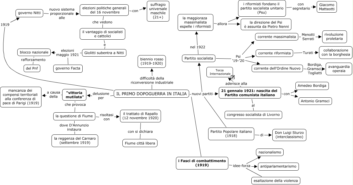Questa Cmap, creata con IHMC CmapTools, contiene informazioni relative a: IL PRIMO DOPOGUERRA IN ITALIA, corrente massimalista Menotti Serrati rivoluzione proletaria, IL PRIMO DOPOGUERRA IN ITALIA delusione per "vittoria mutilata", 21 gennaio 1921: nascita del Partito comunista italiano aderisce alla Terza Internazionale, 21 gennaio 1921: nascita del Partito comunista italiano con Antonio Gramsci, la questione di Fiume dove D'Annunzio instaura la reggenza del Carnaro (settembre 1919), Partito socialista Psi '19-'20 corrente massimalista, elezioni politiche generali del 16 novembre con suffragio universale maschile (21+), la maggioraza massimalista espelle i riformisti allora la direzione del Psi è assunta da Pietro Nenni, elezioni politiche generali del 16 novembre che vedono il vantaggio di socialisti e cattolici, i riformisti fondano il partito socialista unitario (Psu) con segretario Giacomo Matteotti, Partito socialista nel 1922 la maggioraza massimalista espelle i riformisti, i Fasci di combattimento (1919) idee-forza esaltazione della violenza, i Fasci di combattimento (1919) idee-forza antiparlamentarismo, Giolitti subentra a Nitti elezioni maggio 1921 governo Facta, blocco nazionale rafforzamento del Pnf, "vittoria mutilata" che provoca la questione di Fiume, il trattato di Rapallo (12 novembre 1920) con si dichiara Fiume città libera, IL PRIMO DOPOGUERRA IN ITALIA nuovi partiti Partito socialista, la questione di Fiume risoltasi con il trattato di Rapallo (12 novembre 1920), i Fasci di combattimento (1919) idee-forza nazionalismo