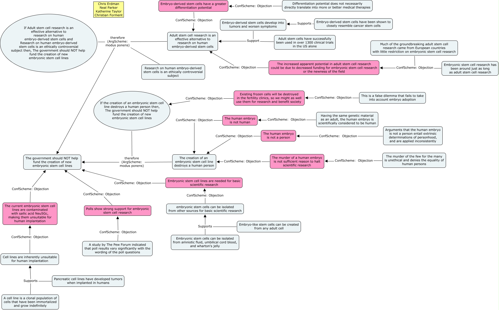 This Concept Map, created with IHMC CmapTools, has information related to: contraESCR, Much of the groundbreaking adult stem cell research came from European countries with little restriction on embryonic stem cell research ConfScheme: Objection The increased apparent potential in adult stem cell research could be due to decreased funding for embryonic stem cell research or the newness of the field, embryonic stem cells can be isolated from other sources for basic scientific research ConfScheme: Objection Embryonic stem cell lines are needed for basic scientific research, Embryo-derived stem cells develop into tumors and worsen symptoms Support Adult stem cell research is an effective alternative to research on human embryo-derived stem cells, Arguments that the human embryo is not a person entail extrinsic determinations of personhood, and are applied inconsistently ConfScheme: Objection The human embryo is not a person, If Adult stem cell research is an effective alternative to research on human embryo-derived stem cells and Research on human embryo-derived stem cells is an ethically controversial subject then, The government should NOT help fund the creation of new embryonic stem cell lines therefore (ArgScheme: modus ponens) The government should NOT help fund the creation of new embryonic stem cell lines, A cell line is a clonal population of cells that have been immortalized and grow indefinitely Supports Cell lines are inherently unsuitable for human implantation, Adult stem cell research is an effective alternative to research on human embryo-derived stem cells therefore (ArgScheme: modus ponens) The government should NOT help fund the creation of new embryonic stem cell lines, Embryonic stem cell research has been around just as long as adult stem cell research ConfScheme: Objection The increased apparent potential in adult stem cell research could be due to decreased funding for embryonic stem cell research or the newness of the field, Embryo-derived stem cells have a greater differentiation potential ConfScheme: Objection Adult stem cell research is an effective alternative to research on human embryo-derived stem cells, The murder of the few for the many is unethical and denies the equality of human persons ConfScheme: Objection The murder of a human embryo is not sufficient reason to halt scientific research, The murder of a human embryo is not sufficient reason to halt scientific research ConfScheme: Objection The creation of an embryonic stem cell line destroys a human person, The human embryo is not human ConfScheme: Objection The creation of an embryonic stem cell line destroys a human person, Differentiation potential does not necessarily directly translate into more or better medical therapies ConfScheme: Objection Embryo-derived stem cells have a greater differentiation potential, The human embryo is not a person ConfScheme: Objection The creation of an embryonic stem cell line destroys a human person, Embryo-derived stem cells have been shown to closely resemble cancer stem cells Supports Embryo-derived stem cells develop into tumors and worsen symptoms, Pancreatic cell lines have developed tumors when implanted in humans Supports Cell lines are inherently unsuitable for human implantation, Research on human embryo-derived stem cells is an ethically controversial subject therefore (ArgScheme: modus ponens) The government should NOT help fund the creation of new embryonic stem cell lines, This is a false dilemma that fails to take into account embryo adoption ConfScheme: Objection Existing frozen cells will be destroyed in the fertility clinics, so we might as well use them for research and benefit society, The creation of an embryonic stem cell line destroys a human person therefore (ArgScheme: modus ponens) The government should NOT help fund the creation of new embryonic stem cell lines, Having the same genetic material as an adult, the human embryo is scientifically considered to be human ConfScheme: Objection The human embryo is not human