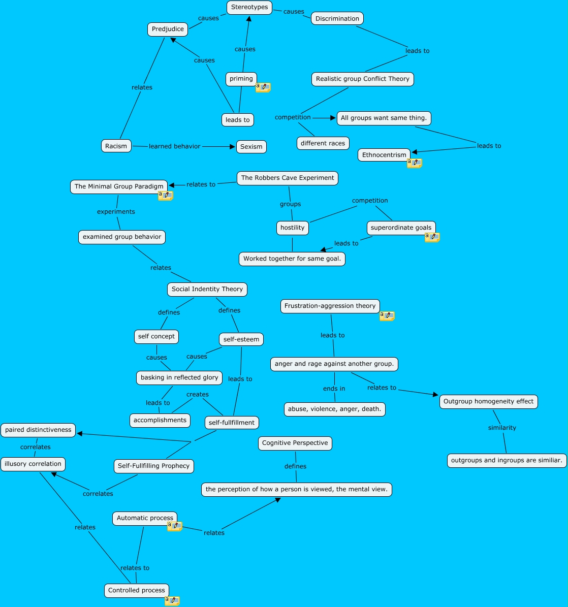 This Concept Map, created with IHMC CmapTools, has information related to: SPD, Predjudice relates Racism, self-esteem causes basking in reflected glory, leads to causes Predjudice, Stereotypes causes Predjudice, hostility Worked together for same goal., leads to causes Stereotypes, Automatic process relates to Controlled process, Social Indentity Theory defines self concept, Outgroup homogeneity effect similarity outgroups and ingroups are similiar., Social Indentity Theory defines self-esteem, illusory correlation relates Controlled process, The Robbers Cave Experiment relates to The Minimal Group Paradigm, anger and rage against another group. relates to Outgroup homogeneity effect, Self-Fullfilling Prophecy correlates illusory correlation, Realistic group Conflict Theory competition All groups want same thing., Automatic process relates the perception of how a person is viewed, the mental view., self-fullfillment paired distinctiveness, paired distinctiveness correlates illusory correlation, Racism learned behavior Sexism, Cognitive Perspective defines the perception of how a person is viewed, the mental view.