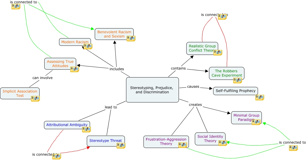 This Concept Map, created with IHMC CmapTools, has information related to: SPD, Stereotyping, Prejudice, and Discrimination includes Modern Racism, Realistic Group Conflict Theory is connected to The Robbers Cave Experiment, Frustration-Aggression Theory is connected to Minimal Group Paradigm, Modern Racism is connected to Benevolent Racism and Sexism, Attributional Ambiguity is connected to Stereotype Threat, Stereotyping, Prejudice, and Discrimination includes Benevolent Racism and Sexism, Assessing True Attitudes can involve Implicit Association Test, Stereotyping, Prejudice, and Discrimination includes Assessing True Attitudes, Stereotyping, Prejudice, and Discrimination causes Self-Fulfiling Prophecy, Assessing True Attitudes is connected to Benevolent Racism and Sexism, Stereotyping, Prejudice, and Discrimination contains Realistic Group Conflict Theory, Frustration-Aggression Theory is connected to Social Identity Theory, Stereotyping, Prejudice, and Discrimination creates Minimal Group Paradigm, Stereotyping, Prejudice, and Discrimination lead to Stereotype Threat, Stereotyping, Prejudice, and Discrimination creates Social Identity Theory, Stereotyping, Prejudice, and Discrimination creates Frustration-Aggression Theory, Stereotyping, Prejudice, and Discrimination lead to Attributional Ambiguity, Stereotyping, Prejudice, and Discrimination contains The Robbers Cave Experiment
