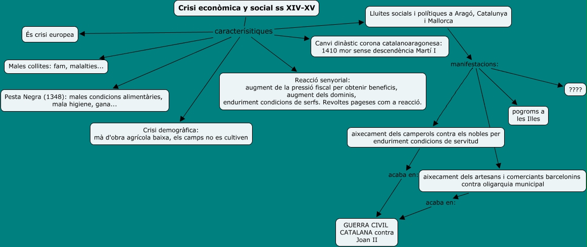 Este Cmap, tiene información relacionada con: CRISI XIV-XV, Crisi econòmica y social ss XIV-XV caracterísitiques Reacció senyorial: augment de la pressió fiscal per obtenir beneficis, augment dels dominis, enduriment condicions de serfs. Revoltes pageses com a reacció., aixecament dels artesans i comerciants barcelonins contra oligarquia municipal acaba en: GUERRA CIVIL CATALANA contra Joan II, Lluites socials i polítiques a Aragó, Catalunya i Mallorca manifestacions: aixecament dels artesans i comerciants barcelonins contra oligarquia municipal, Crisi econòmica y social ss XIV-XV caracterísitiques Canvi dinàstic corona catalanoaragonesa: 1410 mor sense descendència Martí I, Lluites socials i polítiques a Aragó, Catalunya i Mallorca manifestacions: pogroms a les Illes, Lluites socials i polítiques a Aragó, Catalunya i Mallorca manifestacions: ????, Crisi econòmica y social ss XIV-XV caracterísitiques Pesta Negra (1348): males condicions alimentàries, mala higiene, gana..., Crisi econòmica y social ss XIV-XV caracterísitiques És crisi europea, aixecament dels camperols contra els nobles per enduriment condicions de servitud acaba en: GUERRA CIVIL CATALANA contra Joan II, Lluites socials i polítiques a Aragó, Catalunya i Mallorca manifestacions: aixecament dels camperols contra els nobles per enduriment condicions de servitud, Crisi econòmica y social ss XIV-XV caracterísitiques Crisi demogràfica: mà d'obra agrícola baixa, els camps no es cultiven, Crisi econòmica y social ss XIV-XV caracterísitiques Males collites: fam, malalties..., Crisi econòmica y social ss XIV-XV caracterísitiques Lluites socials i polítiques a Aragó, Catalunya i Mallorca