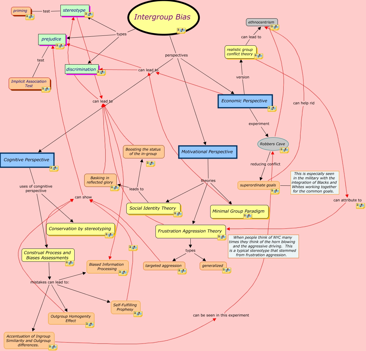 This Concept Map, created with IHMC CmapTools, has information related to: SPD, Robbers Cave ???? ethnocentrism, Frustration Aggression Theory can lead to stereotype, Motivational Perspective theories Frustration Aggression Theory, Construal Process and Biases Assessments mistakes can lead to: Biased Information Processing, Minimal Group Paradigm can lead to prejudice, Construal Process and Biases Assessments can show prejudice, Intergroup Bias types stereotype, Economic Perspective can lead to discrimination, realistic group conflict theory can lead to ethnocentrism, Frustration Aggression Theory types generalized, Robbers Cave reducing conflict superordinate goals, Minimal Group Paradigm can lead to discrimination, Social Identity Theory leads to Basking in reflected glory, stereotype can lead to Biased Information Processing, This is especially seen in the military with the integration of Blacks and Whites working together for the common goals. ???? superordinate goals, Boosting the status of the in-group can lead to stereotype, Motivational Perspective theories Minimal Group Paradigm, Basking in reflected glory can lead to stereotype, Construal Process and Biases Assessments mistakes can lead to: Accentuation of Ingroup Similiarity and Outgroup differences., prejudice test Implicit Association Test