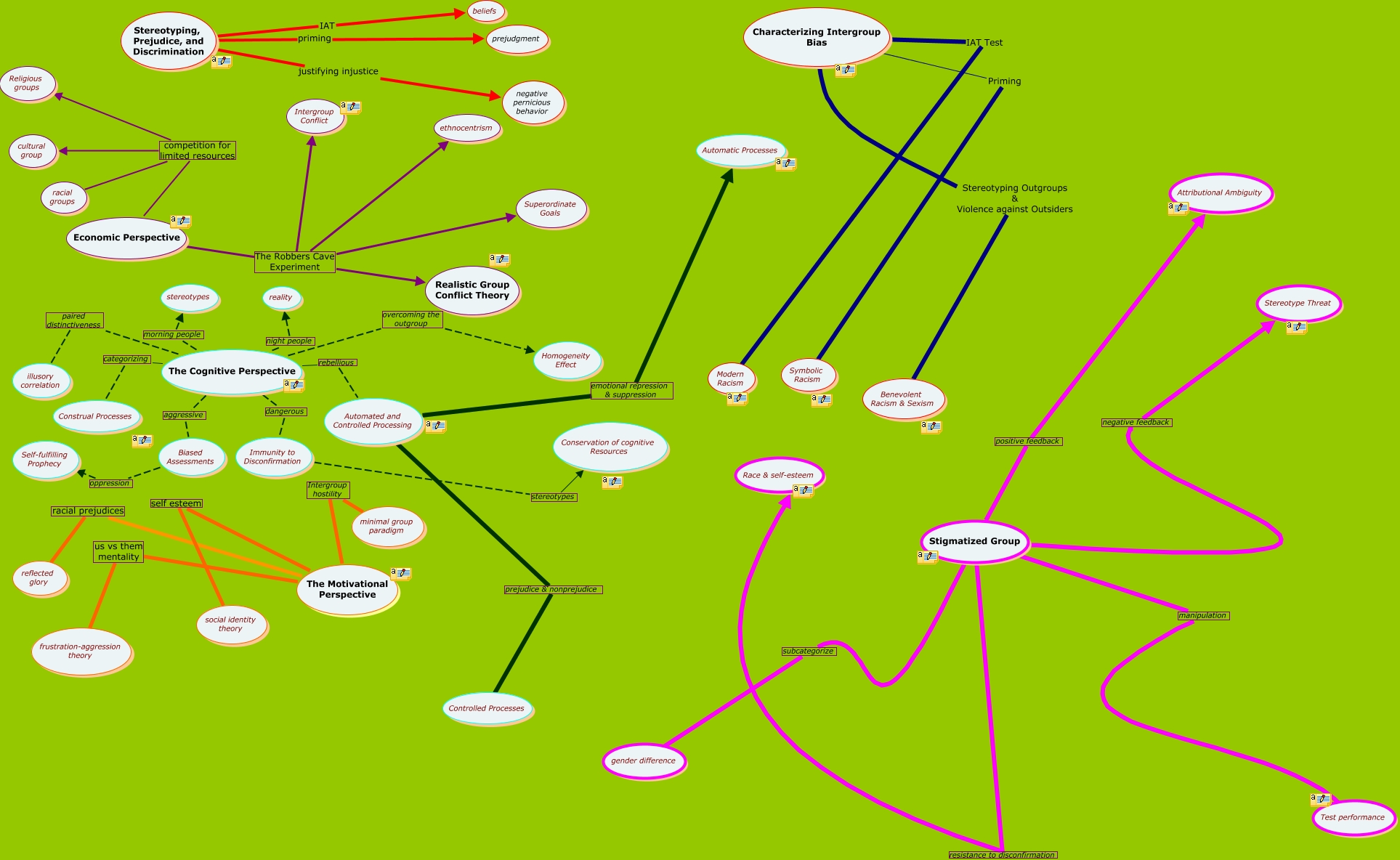 This Concept Map, created with IHMC CmapTools, has information related to: SPD, Stereotyping, Prejudice, and Discrimination priming prejudgment, Stigmatized Group negative feedback Stereotype Threat, Stigmatized Group resistance to disconfirmation Race & self-esteem, The Motivational Perspective Intergroup hostility minimal group paradigm, Immunity to Disconfirmation stereotypes Conservation of cognitive Resources, Stereotyping, Prejudice, and Discrimination IAT beliefs, The Motivational Perspective self esteem social identity theory, Economic Perspective The Robbers Cave Experiment Intergroup Conflict, Stigmatized Group subcategorize gender difference, The Cognitive Perspective overcoming the outgroup Homogeneity Effect, The Cognitive Perspective dangerous Immunity to Disconfirmation, The Cognitive Perspective aggressive Biased Assessments, Stigmatized Group positive feedback Attributional Ambiguity, Stereotyping, Prejudice, and Discrimination justifying injustice negative pernicious behavior, Characterizing Intergroup Bias Priming Symbolic Racism, Automated and Controlled Processing emotional repression & suppression Automatic Processes, Economic Perspective competition for limited resources cultural group, The Cognitive Perspective rebellious Automated and Controlled Processing, Stigmatized Group manipulation Test performance, The Cognitive Perspective categorizing Construal Processes