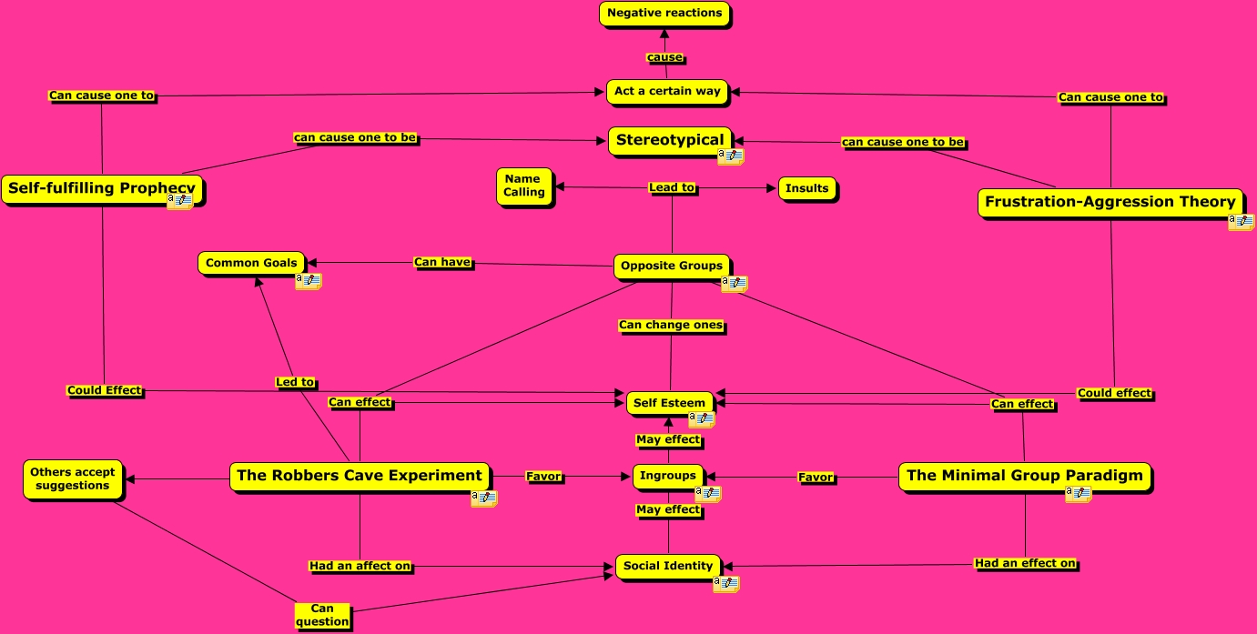 This Concept Map, created with IHMC CmapTools, has information related to: SPD, Frustration-Aggression Theory can cause one to be Stereotypical, The Minimal Group Paradigm Had an effect on Social Identity, Opposite Groups Lead to Insults, The Minimal Group Paradigm Favor Ingroups, The Minimal Group Paradigm Can effect Self Esteem, Opposite Groups Can effect Self Esteem, Frustration-Aggression Theory Could effect Self Esteem, The Robbers Cave Experiment Had an affect on Social Identity, Act a certain way cause Negative reactions, Opposite Groups Can effect Self Esteem, The Robbers Cave Experiment Led to Common Goals, Ingroups May effect Social Identity, Opposite Groups Can have Common Goals, Opposite Groups Can change ones Self Esteem, The Robbers Cave Experiment ???? Others accept suggestions, Ingroups May effect Self Esteem, The Robbers Cave Experiment Can effect Self Esteem, Self-fulfilling Prophecy can cause one to be Stereotypical, The Robbers Cave Experiment Favor Ingroups, Self-fulfilling Prophecy Could Effect Self Esteem