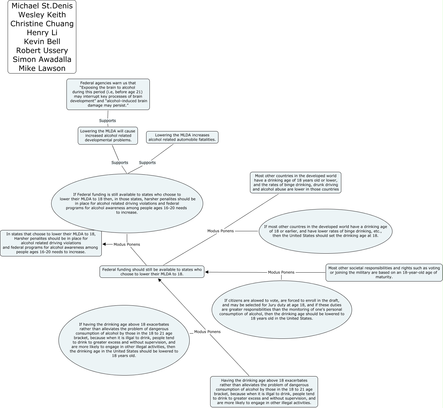 This Concept Map, created with IHMC CmapTools, has information related to: Assignment 15.2, Most other countries in the developed world have a drinking age of 18 years old or lower, and the rates of binge drinking, drunk driving and alcohol abuse are lower in those countries Modus Ponens Federal funding should still be available to states who choose to lower their MLDA to 18., If Federal funding is still available to states who choose to lower their MLDA to 18 then, in those states, harsher penalites should be in place for alcohol related driving violations and federal programs for alcohol awareness among people ages 16-20 needs to increase. Modus Ponens In states that choose to lower their MLDA to 18, Harsher penalites should be in place for alcohol related driving violations and federal programs for alcohol awareness among people ages 16-20 needs to increase., Most other societal responsibilities and rights such as voting or joining the military are based on an 18-year-old age of maturity. Modus Ponens Federal funding should still be available to states who choose to lower their MLDA to 18., Having the drinking age above 18 exacerbates rather than alleviates the problem of dangerous consumption of alcohol by those in the 18 to 21 age bracket, because when it is illgal to drink, people tend to drink to greater excess and without supervision, and are more likely to engage in other illegal activities. Modus Ponens Federal funding should still be available to states who choose to lower their MLDA to 18., Federal funding should still be available to states who choose to lower their MLDA to 18. Modus Ponens In states that choose to lower their MLDA to 18, Harsher penalites should be in place for alcohol related driving violations and federal programs for alcohol awareness among people ages 16-20 needs to increase., Lowering the MLDA will cause increased alcohol related developmental problems. Supports If Federal funding is still available to states who choose to lower their MLDA to 18 then, in those states, harsher penalites should be in place for alcohol related driving violations and federal programs for alcohol awareness among people ages 16-20 needs to increase., If most other countres in the developed world have a drinking age of 18 or earlier, and have lower rates of binge drinking, etc., then the United States should set the drinking age at 18. Modus Ponens Federal funding should still be available to states who choose to lower their MLDA to 18., If having the drinking age above 18 exacerbates rather than alleviates the problem of dangerous consumption of alcohol by those in the 18 to 21 age bracket, because when it is illgal to drink, people tend to drink to greater excess and without supervision, and are more likely to engage in other illegal activities, then the drinking age in the United States should be lowered to 18 years old. Modus Ponens Federal funding should still be available to states who choose to lower their MLDA to 18., Federal agencies warn us that “Exposing the brain to alcohol during this period (i.e, before age 21) may interrupt key processes of brain development” and “alcohol–induced brain damage may persist.” Supports Lowering the MLDA will cause increased alcohol related developmental problems., The drinking age in the United States should be lowered to 18 years old.* Modus Ponens In states that choose to lower their MLDA to 18, Harsher penalites should be in place for alcohol related driving violations and federal programs for alcohol awareness among people ages 16-20 needs to increase., If citizens are alowed to vote, are forced to enroll in the draft, and may be selected for Jury duty at age 18, and if these duties are greater responsibilities than the monitoring of one's personal consumption of alcohol, then the drinking age should be lowered to 18 years old in the United States. Modus Ponens Federal funding should still be available to states who choose to lower their MLDA to 18., Lowering the MLDA increases alcohol related automobile fatalities. Supports If Federal funding is still available to states who choose to lower their MLDA to 18 then, in those states, harsher penalites should be in place for alcohol related driving violations and federal programs for alcohol awareness among people ages 16-20 needs to increase.
