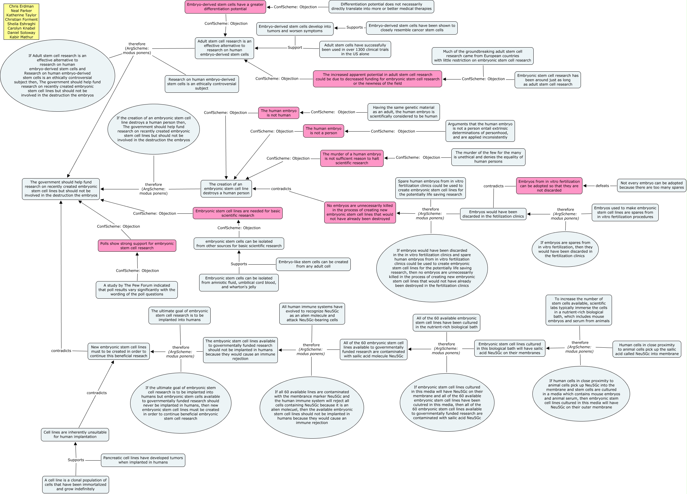 This Concept Map, created with IHMC CmapTools, has information related to: Embryonic Stem Cell Research, Research on human embryo-derived stem cells is an ethically controversial subject therefore (ArgScheme: modus ponens) The government should help fund research on recently created embryonic stem cell lines but should not be involved in the destruction the embryos, If embryos would have been discarded in the in vitro fertilization clinics and spare human embryos from in vitro fertilization clinics could be used to create embryonic stem cell lines for the potentially life saving research, then no embryos are unnecessarily killed in the process of creating new embryonic stem cell lines that would not have already been destroyed in the fertilization clinics therefore (ArgScheme: modus ponens) No embryos are unnecessarily killed in the process of creating new embryonic stem cell lines that would not have already been destroyed, The human embryo is not human ConfScheme: Objection The creation of an embryonic stem cell line destroys a human person, All human immune systems have evolved to recognize Neu5Gc as an alien molecule and attack Neu5Gc-bearing cells therefore (ArgScheme: modus ponens) The embyonic stem cell lines available to governmentally funded research should not be implanted in humans because they would cause an immune rejection, Embryonic stem cell lines cultured in this biological bath will have sailic acid Neu5Gc on their membranes therefore (ArgScheme: modus ponens) All of the 60 embryonic stem cell lines available to governmentally funded research are contaminated with sailic acid molecule Neu5Gc, Embryos from in vitro fertilization can be adopted so that they are not discarded contradicts Embryos would have been discarded in the fetilization clinics, The murder of a human embryo is not sufficient reason to halt scientific research ConfScheme: Objection The creation of an embryonic stem cell line destroys a human person, A study by The Pew Forum indicated that poll results vary significantly with the wording of the poll questions ConfScheme: Objection Polls show strong support for embryonic stem cell research, Differentiation potential does not necessarily directly translate into more or better medical therapies ConfScheme: Objection Embryo-derived stem cells have a greater differentiation potential, If the creation of an embryonic stem cell line destroys a human person then, The government should help fund research on recently created embryonic stem cell lines but should not be involved in the destruction the embryos therefore (ArgScheme: modus ponens) The government should help fund research on recently created embryonic stem cell lines but should not be involved in the destruction the embryos, If embryos are spares from in vitro fertilization, then they would have been discarded in the fertilization clinics therefore (ArgScheme: modus ponens) Embryos would have been discarded in the fetilization clinics, The murder of the few for the many is unethical and denies the equality of human persons ConfScheme: Objection The murder of a human embryo is not sufficient reason to halt scientific research, If human cells in close proximity to animal cells pick up Neu5Gc into the membrane and stem cells are cultured in a media which contains mouse embryos and animal serum, then embryonic stem cell lines cultured in this media will have Neu5Gc on their outer membrane therefore (ArgScheme: modus ponens) Embryonic stem cell lines cultured in this biological bath will have sailic acid Neu5Gc on their membranes, Human cells in close proximity to animal cells pick up the sailic acid called Neu5Gc into membrane therefore (ArgScheme: modus ponens) Embryonic stem cell lines cultured in this biological bath will have sailic acid Neu5Gc on their membranes, Embryos would have been discarded in the fetilization clinics therefore (ArgScheme: modus ponens) No embryos are unnecessarily killed in the process of creating new embryonic stem cell lines that would not have already been destroyed, If all 60 available lines are contaminated with the membrance marker Neu5Gc and the human immune system will reject all cells containing Neu5Gc because it is an alien molecuel, then the available embryonic stem cell lines should not be implanted in humans because they would cause an immune rejection therefore (ArgScheme: modus ponens) The embyonic stem cell lines available to governmentally funded research should not be implanted in humans because they would cause an immune rejection, Spare human embryos from in vitro fertilization clinics could be used to create embryonic stem cell lines for the potentially life saving research therefore (ArgScheme: modus ponens) No embryos are unnecessarily killed in the process of creating new embryonic stem cell lines that would not have already been destroyed, Embryonic stem cell lines are needed for basic scientific research ConfScheme: Objection The government should help fund research on recently created embryonic stem cell lines but should not be involved in the destruction the embryos, The ultimate goal of embryonic stem cell research is to be implanted into humans therefore (ArgScheme: modus ponens) New embryonic stem cell lines must to be created in order to continue this beneficial reseach, Having the same genetic material as an adult, the human embryo is scientifically considered to be human ConfScheme: Objection The human embryo is not human