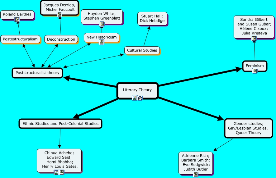 Este Cmap, tiene información relacionada con: Literary Theory 3, Literary Theory Ethnic Studies and Post-Colonial Studies, Poststructuralist theory Postestructuralism, New Historicism Hayden White; Stephen Greenblatt, Literary Theory Poststructuralist theory, Literary Theory Gender studies; Gay/Lesbian Studies. Queer Theory, Poststructuralist theory New Historicism, Literary Theory Feminism, Feminism Sandra Gilbert and Susan Gubar; Hélène Cixoux; Julia Kristeva, Poststructuralist theory Deconstruction, Postestructuralism Roland Barthes, Ethnic Studies and Post-Colonial Studies Chinua Achebe; Edward Said; Homi Bhabha; Henry Louis Gates., Gender studies; Gay/Lesbian Studies. Queer Theory Adrienne Rich; Barbara Smith; Eve Sedgwick; Judith Butler, Deconstruction Jacques Derrida, Michel Faucoult, Poststructuralist theory Cultural Studies, Cultural Studies Stuart Hall; Dick Hebdige
