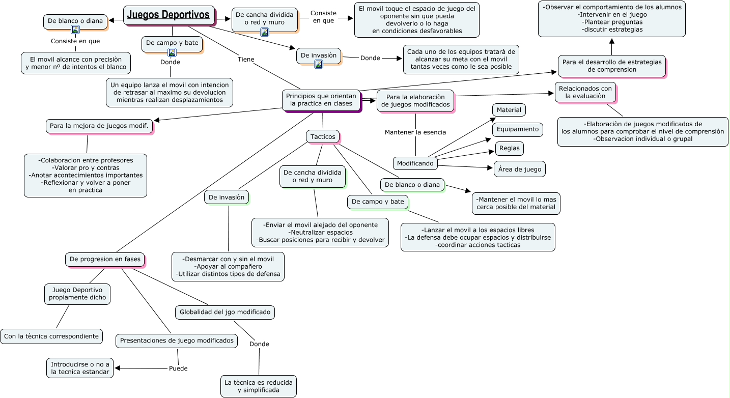 Este Cmap, tiene información relacionada con: Pamela Martinez Nadia Argañaraz y Eugenia Hahn, De campo y bate ???? -Lanzar el movil a los espacios libres -La defensa debe ocupar espacios y distribuirse -coordinar acciones tacticas, Tacticos ???? De blanco o diana, De progresion en fases ???? Juego Deportivo propiamente dicho, Tacticos ???? De invasiòn, Tacticos ???? De campo y bate, Principios que orientan la practica en clases ???? Relacionados con la evaluaciòn, Para el desarrollo de estrategias de comprension ???? -Observar el comportamiento de los alumnos -Intervenir en el juego -Plantear preguntas -discutir estrategias, De invasiòn ???? -Desmarcar con y sin el movil -Apoyar al compañero -Utilizar distintos tipos de defensa, Para la elaboraciòn de juegos modificados Mantener la esencia Modificando, Presentaciones de juego modificados Puede Introducirse o no a la tecnica estandar, Para la mejora de juegos modif. ???? -Colaboracion entre profesores -Valorar pro y contras -Anotar acontecimientos importantes -Reflexionar y volver a poner en practica, Juegos Deportivos ???? De cancha dividida o red y muro, Principios que orientan la practica en clases ???? Para la elaboraciòn de juegos modificados, Tacticos ???? De cancha dividida o red y muro, De cancha dividida o red y muro ???? -Enviar el movil alejado del oponente -Neutralizar espacios -Buscar posiciones para recibir y devolver, De blanco o diana Consiste en que El movil alcance con precisiòn y menor nº de intentos el blanco, Principios que orientan la practica en clases ???? Tacticos, Principios que orientan la practica en clases ???? Para el desarrollo de estrategias de comprension, Modificando ???? Equipamiento, Juegos Deportivos Tiene Principios que orientan la practica en clases