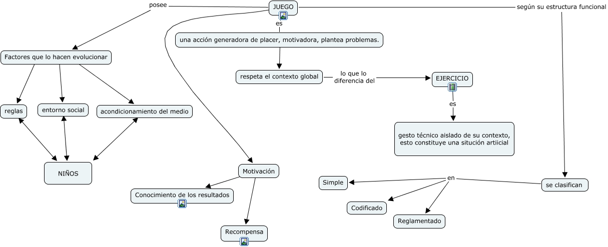 Este Cmap, tiene información relacionada con: Juego.Blasquez Sánchez, Motivación ???? Recompensa, entorno social ???? NIÑOS, se clasifican en Codificado, EJERCICIO es gesto técnico aislado de su contexto, esto constituye una situción artiicial, JUEGO posee Factores que lo hacen evolucionar, acondicionamiento del medio ???? NIÑOS, JUEGO es una acción generadora de placer, motivadora, plantea problemas., Factores que lo hacen evolucionar ???? reglas, Factores que lo hacen evolucionar ???? acondicionamiento del medio, respeta el contexto global lo que lo diferencia del EJERCICIO, JUEGO ???? Motivación, se clasifican en Reglamentado, Motivación ???? Conocimiento de los resultados, Factores que lo hacen evolucionar ???? entorno social, una acción generadora de placer, motivadora, plantea problemas. ???? respeta el contexto global, reglas ???? NIÑOS, se clasifican en Simple, JUEGO según su estructura funcional se clasifican