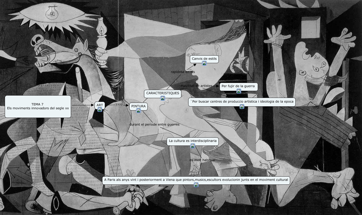 Este Cmap, tiene información relacionada con: tema 7 pintura, TEMA 7 Els moviments innovadors del segle xx ???? ART, CARACTERISTIQUES rapidesa en els Canvis de estils, La cultura es interdisciplinaria es molt habitual A Paris als anys vint i posteriorment a Viena que pintors,musics,escultors evolucionin junts en el moviment cultural, CARACTERISTIQUES movilitat de artistes `Per buscar centres de produccio artistica i ideologia de la epoca, PINTURA ???? CARACTERISTIQUES, PINTURA durant el periode entre guerres La cultura es interdisciplinaria, ART ???? PINTURA, CARACTERISTIQUES movilitat de artistes Per fujir de la guerra