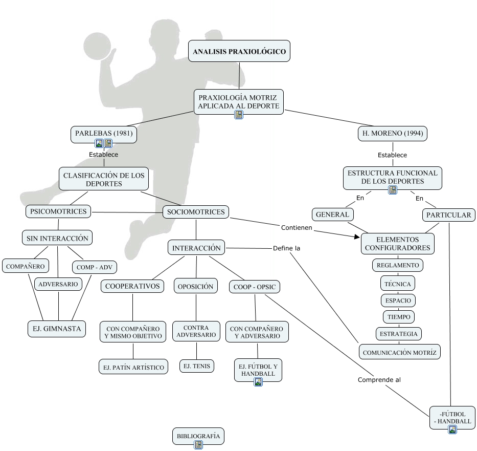Este Cmap, tiene información relacionada con: A. PRAX. PORTIS - TERUEL, INTERACCIÓN Define la COMUNICACIÓN MOTRÍZ, CONTRA ADVERSARIO ???? EJ. TENIS, TIEMPO ???? ESTRATEGIA, CLASIFICACIÓN DE LOS DEPORTES ???? SOCIOMOTRICES, CON COMPAÑERO Y ADVERSARIO ???? EJ. FÚTBOL Y HANDBALL, SIN INTERACCIÓN ???? COMPAÑERO, PARTICULAR ???? ELEMENTOS CONFIGURADORES, INTERACCIÓN ???? COOP - OPSIC, CLASIFICACIÓN DE LOS DEPORTES ???? PSICOMOTRICES, INTERACCIÓN ???? COOPERATIVOS, ELEMENTOS CONFIGURADORES ???? REGLAMENTO, COOP - OPSIC Comprende al -FÚTBOL - HANDBALL, SOCIOMOTRICES Contienen ELEMENTOS CONFIGURADORES, ESTRATEGIA ???? COMUNICACIÓN MOTRÍZ, PRAXIOLOGÍA MOTRIZ APLICADA AL DEPORTE ???? H. MORENO (1994), COMPAÑERO ???? EJ. GIMNASTA, COOP - OPSIC ???? CON COMPAÑERO Y ADVERSARIO, REGLAMENTO ???? TÉCNICA, OPOSICIÓN ???? CONTRA ADVERSARIO, SIN INTERACCIÓN ???? COMP - ADV