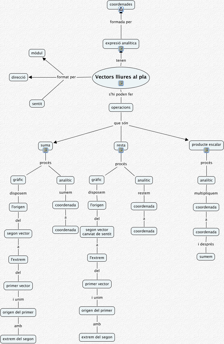Aquest mapa conceptual conté informació relacionada amb: vectors, origen del primer amb extrem del segon, segon vector a l'extrem, coordenada a coordenada, segon vector canviat de sentit a l'extrem, primer vector i unim origen del primer, analític restem coordenada, l'origen del segon vector canviat de sentit, gràfic disposem l'origen, suma procés gràfic, primer vector i unim origen del primer, resta procés gràfic, Vectors lliures al pla format per direcció, analític multipliquem coordenada, Vectors lliures al pla tenen expresió analítica, gràfic disposem l'origen, l'origen del segon vector, suma procés analític, Vectors lliures al pla format per mòdul, expresió analítica formada per coordenades, operacions que són suma
