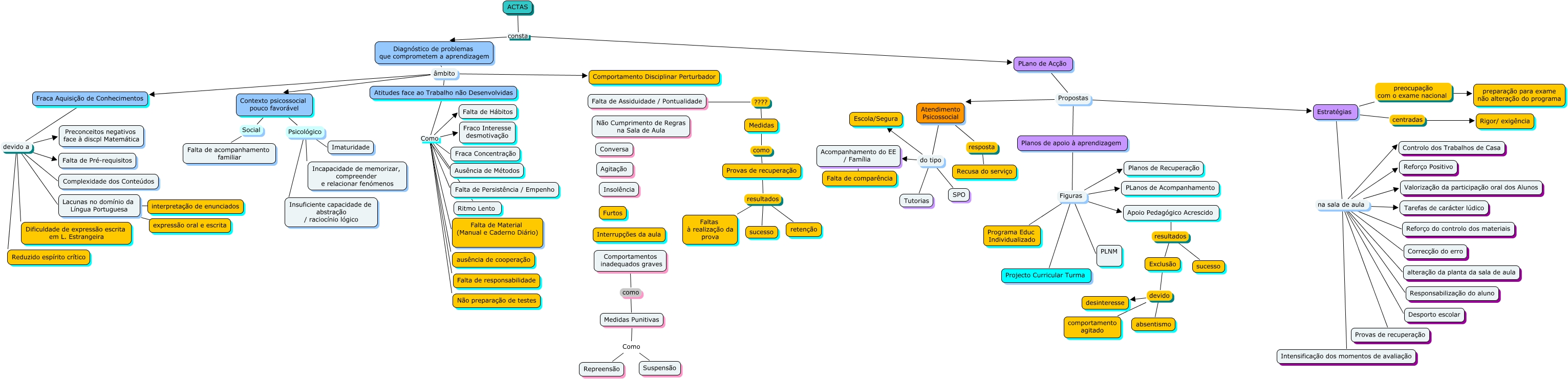 Esse mapa conceitual, produzido no IHMC CmapTools, tem a informação relacionada a: 3º Ciclo - Actas - Justificação dos Níveis Inferiores a 3 - 20082009, Estratégias na sala de aula Reforço do controlo dos materiais, PLano de Acção Propostas Planos de apoio à aprendizagem, Atitudes face ao Trabalho não Desenvolvidas Como Fraca Concentração, Provas de recuperação resultados Faltas à realização da prova, Planos de apoio à aprendizagem Figuras Planos de Recuperação, Estratégias na sala de aula Reforço Positivo, Diagnóstico de problemas que comprometem a aprendizagem âmbito Comportamento Disciplinar Perturbador, Atitudes face ao Trabalho não Desenvolvidas Como ausência de cooperação, Lacunas no domínio da Língua Portuguesa ???? expressão oral e escrita, Atendimento Psicossocial resposta Recusa do serviço, Planos de apoio à aprendizagem Figuras Projecto Curricular Turma, Provas de recuperação resultados retenção, PLano de Acção Propostas Atendimento Psicossocial, Estratégias na sala de aula Provas de recuperação, Contexto psicossocial pouco favorável Social Falta de acompanhamento familiar, Atitudes face ao Trabalho não Desenvolvidas Como Falta de responsabilidade, Exclusão devido absentismo, PLano de Acção Propostas Estratégias, Atendimento Psicossocial do tipo Escola/Segura, Atitudes face ao Trabalho não Desenvolvidas Como Falta de Hábitos