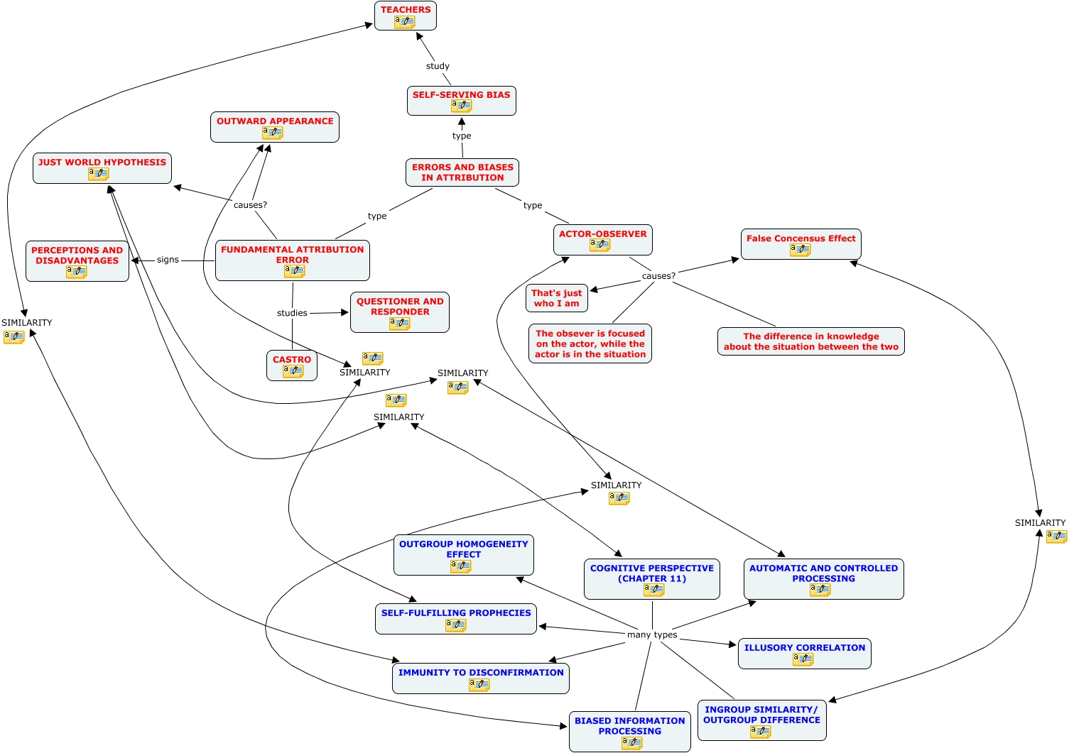 This Concept Map, created with IHMC CmapTools, has information related to: Final, AUTOMATIC AND CONTROLLED PROCESSING SIMILARITY JUST WORLD HYPOTHESIS, SELF-SERVING BIAS study TEACHERS, FUNDAMENTAL ATTRIBUTION ERROR causes? OUTWARD APPEARANCE, COGNITIVE PERSPECTIVE (CHAPTER 11) many types SELF-FULFILLING PROPHECIES, COGNITIVE PERSPECTIVE (CHAPTER 11) many types INGROUP SIMILARITY/ OUTGROUP DIFFERENCE, ERRORS AND BIASES IN ATTRIBUTION type FUNDAMENTAL ATTRIBUTION ERROR, FUNDAMENTAL ATTRIBUTION ERROR signs PERCEPTIONS AND DISADVANTAGES, FUNDAMENTAL ATTRIBUTION ERROR causes? JUST WORLD HYPOTHESIS, ACTOR-OBSERVER SIMILARITY BIASED INFORMATION PROCESSING, ACTOR-OBSERVER causes? The obsever is focused on the actor, while the actor is in the situation, INGROUP SIMILARITY/ OUTGROUP DIFFERENCE SIMILARITY False Concensus Effect, COGNITIVE PERSPECTIVE (CHAPTER 11) SIMILARITY JUST WORLD HYPOTHESIS, COGNITIVE PERSPECTIVE (CHAPTER 11) many types BIASED INFORMATION PROCESSING, FUNDAMENTAL ATTRIBUTION ERROR studies QUESTIONER AND RESPONDER, FUNDAMENTAL ATTRIBUTION ERROR studies CASTRO, ACTOR-OBSERVER causes? False Concensus Effect, ERRORS AND BIASES IN ATTRIBUTION type ACTOR-OBSERVER, COGNITIVE PERSPECTIVE (CHAPTER 11) many types AUTOMATIC AND CONTROLLED PROCESSING, COGNITIVE PERSPECTIVE (CHAPTER 11) many types ILLUSORY CORRELATION, ERRORS AND BIASES IN ATTRIBUTION type SELF-SERVING BIAS