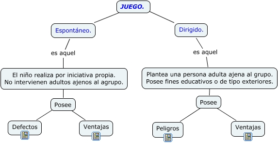 Este Cmap, tiene información relacionada con: Juego espontaneo y dirigido, Posee ???? Ventajas, Posee ???? Peligros, Posee ???? Defectos, JUEGO. ???? Espontáneo., Plantea una persona adulta ajena al grupo. Posee fines educativos o de tipo exteriores. ???? Posee, Dirigido. es aquel Plantea una persona adulta ajena al grupo. Posee fines educativos o de tipo exteriores., JUEGO. ???? Dirigido., Posee ???? Ventajas, Espontáneo. es aquel Posee