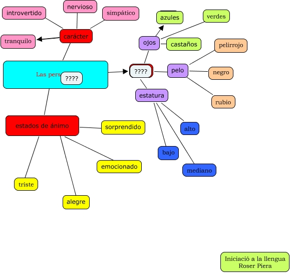 Aquest mapa conceptual conté informació relacionada amb: Descripción personas- Roser Piera, pelo ???? rubio, estatura ???? mediano, estatura ???? bajo, Las personas ???? físico, estados de ánimo ???? Las personas, ojos ???? castaños, carácter ???? tranquilo, estatura ???? alto, ???? ???? alegre, estados de ánimo ???? sorprendido, ojos ???? azules, introvertido ???? carácter, estados de ánimo ???? emocionado, estados de ánimo ???? triste, ojos ???? verdes, físico ???? pelo, carácter ???? simpático, Las personas ???? ????, carácter ???? tranquilo, ???? ???? estatura