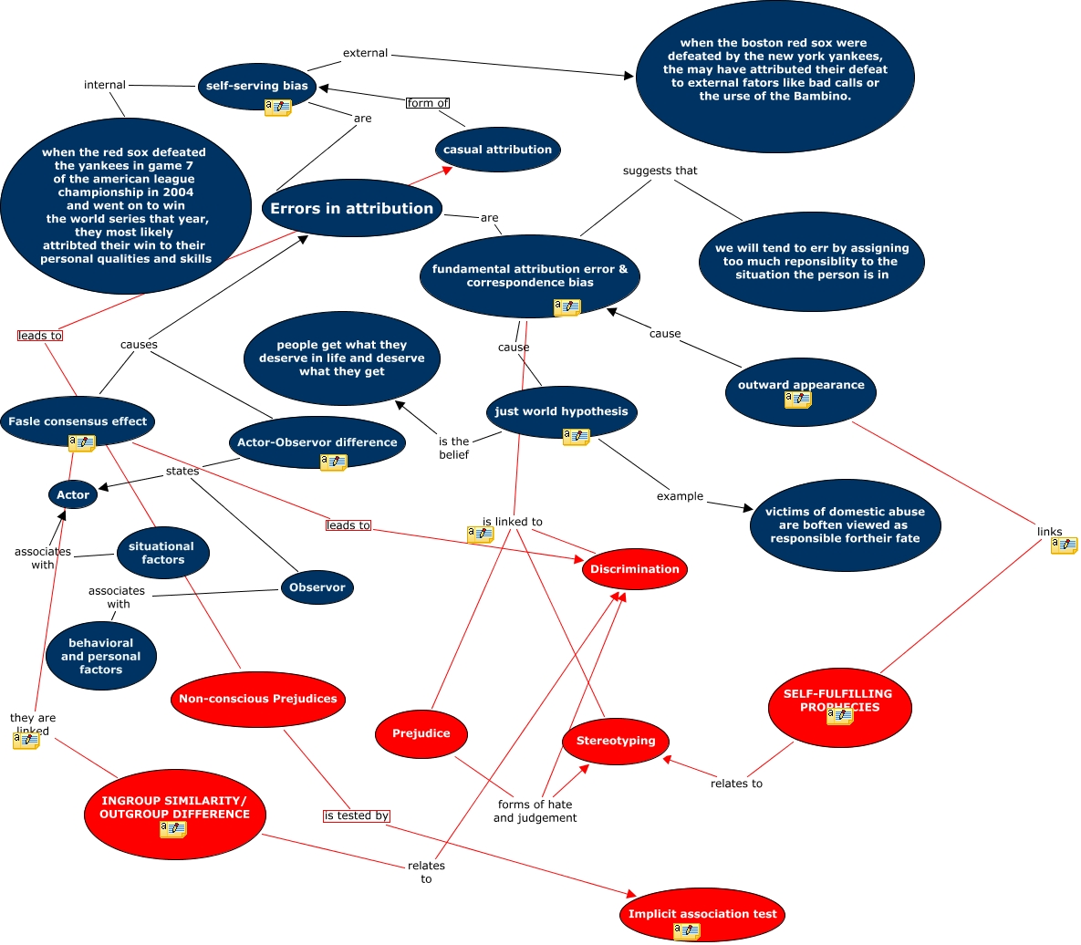 This Concept Map, created with IHMC CmapTools, has information related to: Final, Actor-Observor difference states Actor, self-serving bias are Errors in attribution, Non-conscious Prejudices is tested by Implicit association test, INGROUP SIMILARITY/ OUTGROUP DIFFERENCE relates to Discrimination, just world hypothesis is the belief people get what they deserve in life and deserve what they get, Non-conscious Prejudices leads to casual attribution, casual attribution form of self-serving bias, Fasle consensus effect leads to Discrimination, Prejudice forms of hate and judgement Stereotyping, outward appearance links SELF-FULFILLING PROPHECIES, fundamental attribution error & correspondence bias is linked to Discrimination, SELF-FULFILLING PROPHECIES relates to Stereotyping, Fasle consensus effect causes Errors in attribution, fundamental attribution error & correspondence bias suggests that we will tend to err by assigning too much reponsiblity to the situation the person is in, Prejudice forms of hate and judgement Discrimination, outward appearance cause fundamental attribution error & correspondence bias, fundamental attribution error & correspondence bias is linked to Stereotyping, fundamental attribution error & correspondence bias is linked to Prejudice, Observor associates with behavioral and personal factors, Actor-Observor difference states Observor