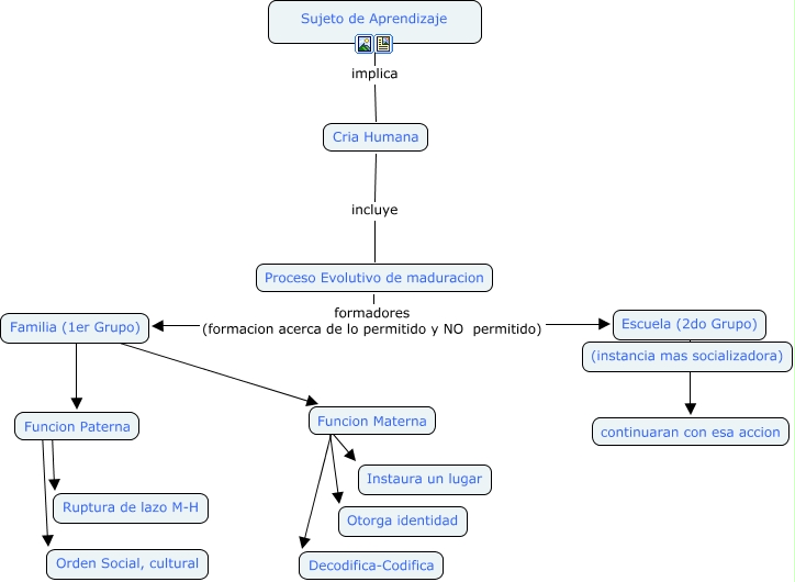 Este Cmap, tiene información relacionada con: Aprendizaje y matrices, Funcion Paterna ???? Orden Social, cultural, Proceso Evolutivo de maduracion formadores (formacion acerca de lo permitido y NO permitido) Familia (1er Grupo), Escuela (2do Grupo) ???? (instancia mas socializadora), Familia (1er Grupo) ???? Funcion Materna, Familia (1er Grupo) ???? Funcion Paterna, Escuela (2do Grupo) ???? continuaran con esa accion, Funcion Materna ???? Decodifica-Codifica, Funcion Materna ???? Otorga identidad, Funcion Materna ???? Instaura un lugar, Proceso Evolutivo de maduracion formadores (formacion acerca de lo permitido y NO permitido) Escuela (2do Grupo), Sujeto de Aprendizaje implica Cria Humana, Funcion Paterna ???? Ruptura de lazo M-H, Cria Humana incluye Proceso Evolutivo de maduracion