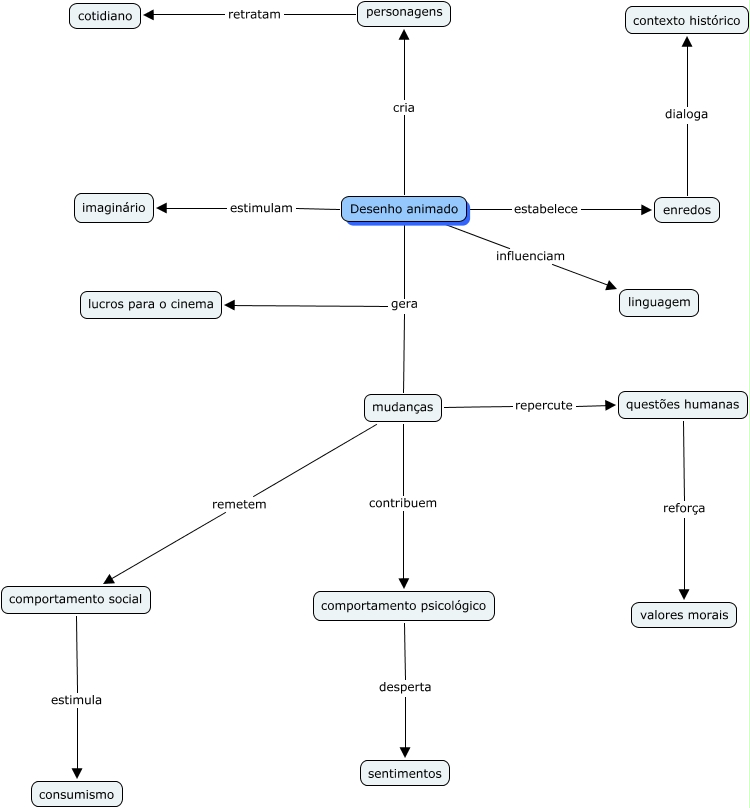 Esse mapa conceitual, produzido no IHMC CmapTools, tem a informação relacionada a: mapa2_desenhosanimados_marlene, questões humanas reforça valores morais, Desenho animado estabelece enredos, Desenho animado cria personagens, mudanças remetem comportamento social, Desenho animado gera lucros para o cinema, comportamento psicológico desperta sentimentos, mudanças repercute questões humanas, comportamento social estimula consumismo, Desenho animado influenciam linguagem, Desenho animado gera mudanças, mudanças contribuem comportamento psicológico, Desenho animado estimulam imaginário, enredos dialoga contexto histórico, personagens retratam cotidiano