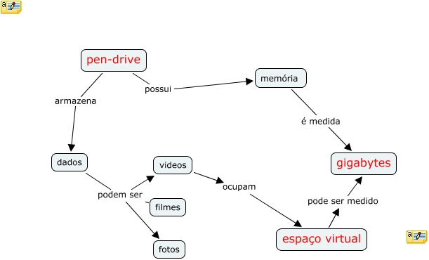 mapa1_magali, videos ocupam espaço virtual, memória é medida gigabytes, espaço virtual pode ser medido gigabytes, pen-drive armazena dados, dados podem ser filmes, pen-drive possui memória, dados podem ser videos, dados podem ser fotos