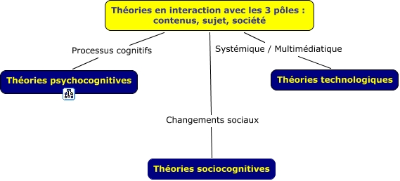 This Concept Map, created with IHMC CmapTools, has information related to: Interaction, Théories en interaction avec les 3 pôles : contenus, sujet, société Processus cognitifs Théories psychocognitives, Théories en interaction avec les 3 pôles : contenus, sujet, société Systémique / Multimédiatique Théories technologiques, Théories en interaction avec les 3 pôles : contenus, sujet, société Changements sociaux Théories sociocognitives