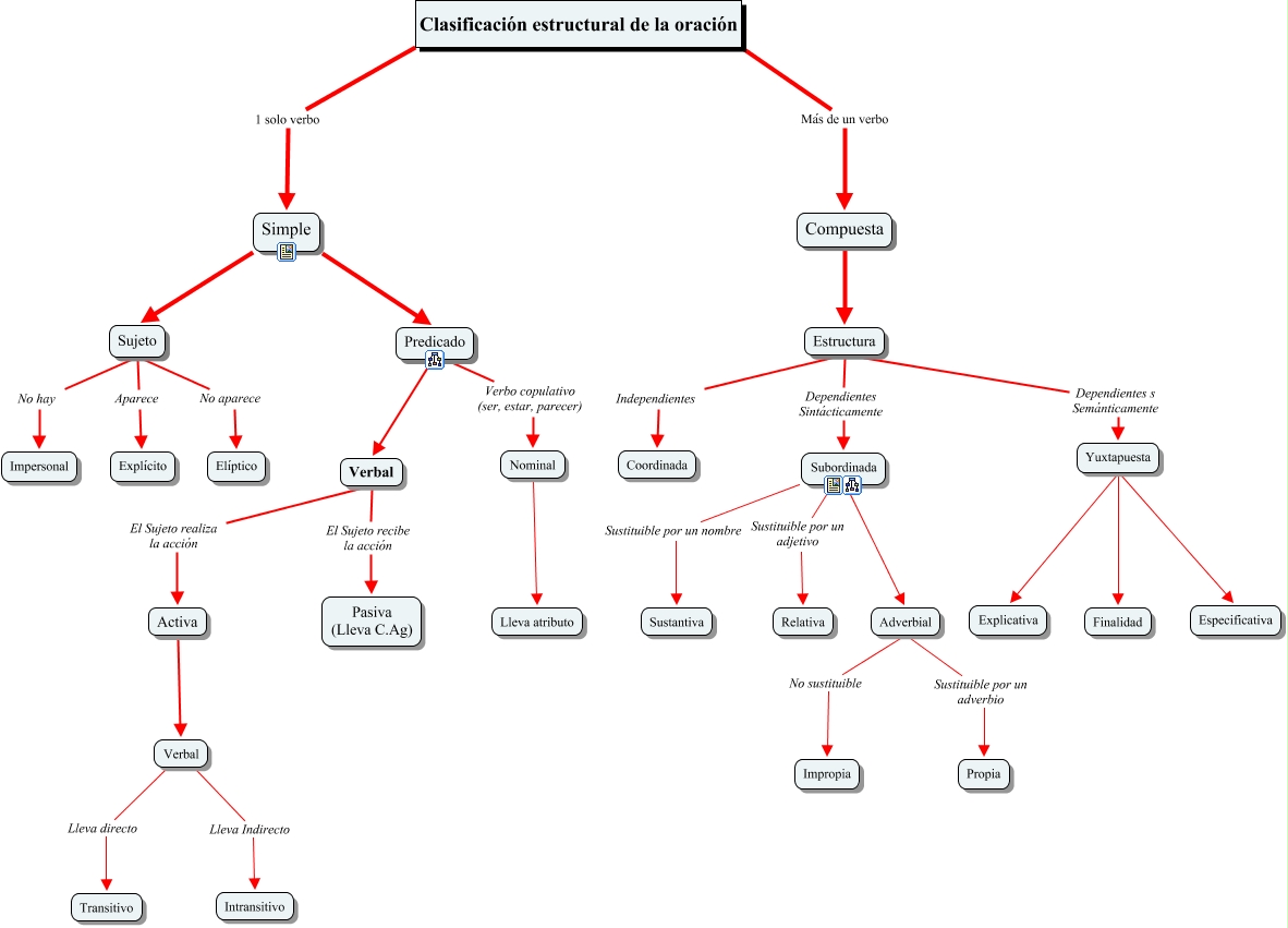 Este Cmap, tiene información relacionada con: Oración, Verbal Lleva Indirecto Intransitivo, Clasificación estructural de la oración 1 solo verbo Simple, Sujeto No aparece Elíptico, Verbal Lleva directo Transitivo, Predicado Verbo copulativo (ser, estar, parecer) Nominal, Adverbial Sustituible por un adverbio Propia, Yuxtapuesta Especificativa, Subordinada Sustituible por un adjetivo Relativa, Predicado Verbal, Activa Verbal, Simple Predicado, Adverbial No sustituible Impropia, Sujeto Aparece Explícito, Estructura Dependientes Sintácticamente Subordinada, Sujeto No hay Impersonal, Subordinada Sustituible por un nombre Sustantiva, Estructura Independientes Coordinada, Yuxtapuesta Explicativa, Nominal Lleva atributo, Verbal El Sujeto realiza la acción Activa