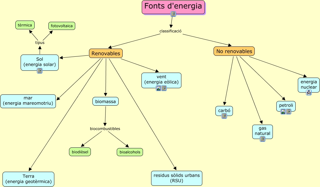 Aquest mapa conceptual conté informació relacionada amb: fonts d'energia_presentacio, Renovables Terra (energia geotèrmica), No renovables gas natural, Fonts d'energia classificació Renovables, No renovables carbó, Fonts d'energia classificació No renovables, No renovables petroli, No renovables energia nuclear, Renovables vent (energia eòlica), Sol (energia solar) tipus tèrmica, Renovables biomassa, Renovables mar (energia mareomotriu), Renovables Sol (energia solar), biomassa biocombustibles biodièsel, Renovables residus sòlids urbans (RSU), biomassa biocombustibles bioalcohols, Sol (energia solar) tipus fotovoltaica