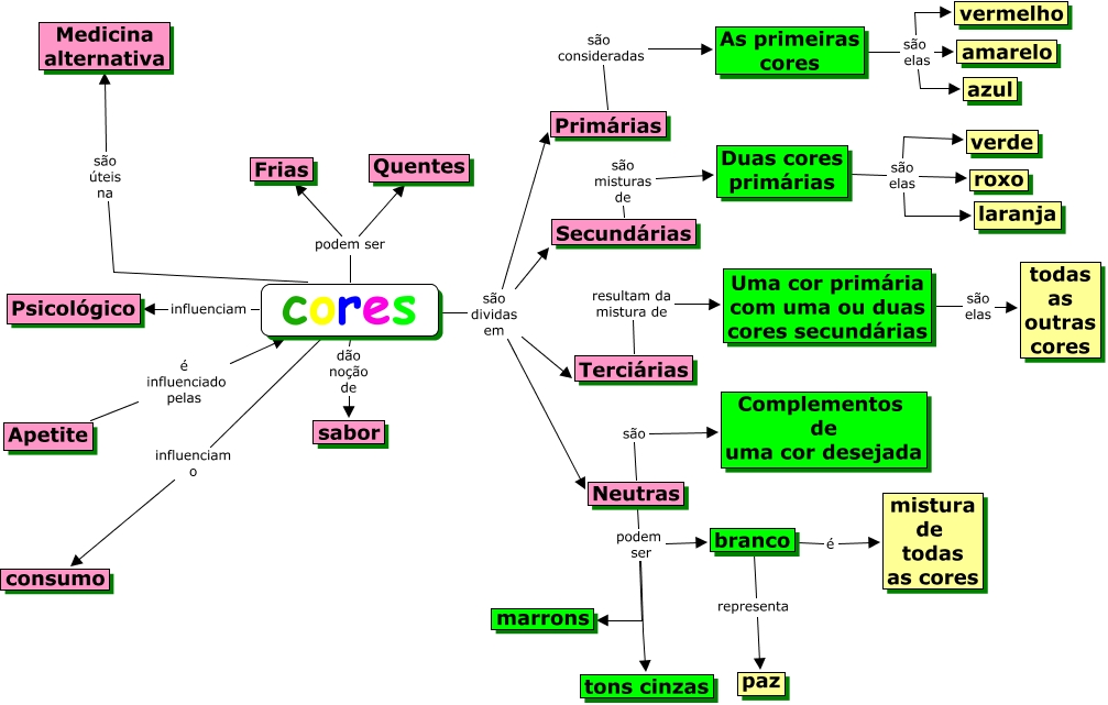 Esse mapa conceitual, produzido no IHMC CmapTools, tem a informação relacionada a: Sueli, Secundárias são misturas de Duas cores primárias, Apetite é influenciado pelas cores, Duas cores primárias são elas laranja, cores são dividas em Neutras, Primárias são consideradas As primeiras cores, branco é mistura de todas as cores, cores influenciam o consumo, As primeiras cores são elas amarelo, Uma cor primária com uma ou duas cores secundárias são elas todas as outras cores, Duas cores primárias são elas verde, cores influenciam Psicológico, branco representa paz, cores podem ser Frias, Terciárias resultam da mistura de Uma cor primária com uma ou duas cores secundárias, Neutras podem ser tons cinzas, cores são dividas em Secundárias, cores são dividas em Primárias, cores são dividas em Terciárias, As primeiras cores são elas vermelho, Neutras são Complementos de uma cor desejada