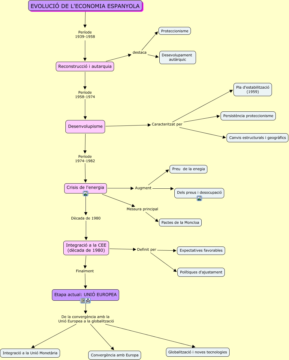 Aquest mapa conceptual conté informació relacionada amb: Evolució de l'economia espanyola_2, Desenvolupisme Període 1974-1982 Crisis de l'energia, Crisis de l'energia Augment Dels preus i desocupació, Crisis de l'energia Augment Preu de la enegia, Desenvolupisme Caracteritzat per Persistència proteccionisme, Desenvolupisme Caracteritzat per Pla d'estabilització (1959), Etapa actual: UNIÓ EUROPEA De la convergència amb la Unió Europea a la globalització Convergència amb Europa, Integració a la CEE (dècada de 1980) Definit per Expectatives favorables, EVOLUCIÓ DE L'ECONOMIA ESPANYOLA Període 1939-1958 Reconstrucció i autarquia, Reconstrucció i autarquia destaca Proteccionisme, Crisis de l'energia Messura principal Pactes de la Moncloa, Crisis de l'energia Dècada de 1980 Integració a la CEE (dècada de 1980), Etapa actual: UNIÓ EUROPEA De la convergència amb la Unió Europea a la globalització Integració a la Unió Monetària, Integració a la CEE (dècada de 1980) Definit per Polítiques d'ajustament, Etapa actual: UNIÓ EUROPEA De la convergència amb la Unió Europea a la globalització Globalització i noves tecnologies, Desenvolupisme Caracteritzat per Canvis estructurals i geogràfics, Integració a la CEE (dècada de 1980) Finalment Etapa actual: UNIÓ EUROPEA, Reconstrucció i autarquia destaca Desevolupament autàrquic, Reconstrucció i autarquia Període 1958-1974 Desenvolupisme