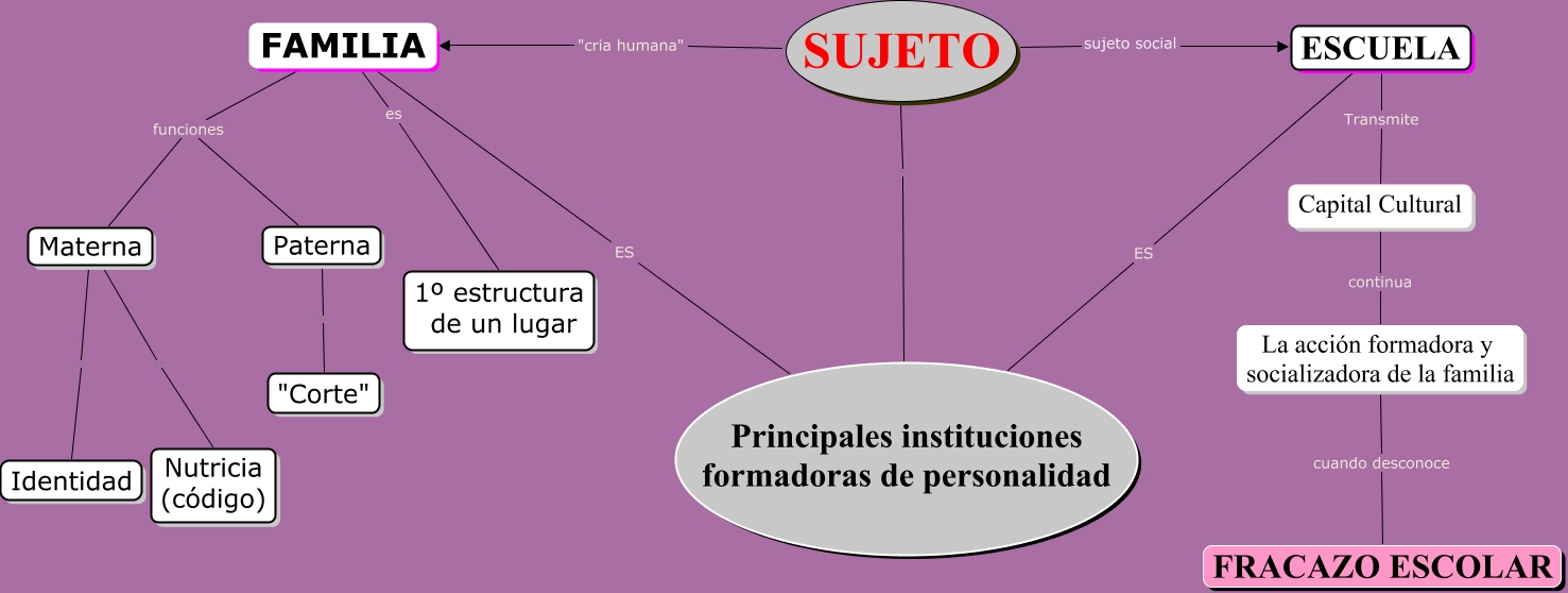 Este Cmap, tiene información relacionada con: PRUZZO DE DI PEGO, FAMILIA es 1º estructura de un lugar, Materna - Identidad, FAMILIA ES Principales instituciones formadoras de personalidad, FAMILIA funciones Paterna, SUJETO - Principales instituciones formadoras de personalidad, Materna - Nutricia (código), Paterna - "Corte", FAMILIA funciones Materna, SUJETO "cria humana" FAMILIA, La acción formadora y socializadora de la familia cuando desconoce FRACAZO ESCOLAR, SUJETO sujeto social ESCUELA, ESCUELA Transmite Capital Cultural, ESCUELA ES Principales instituciones formadoras de personalidad, Capital Cultural continua La acción formadora y socializadora de la familia