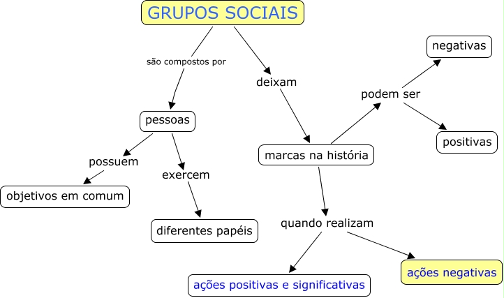 Esse mapa conceitual, produzido no IHMC CmapTools, tem a informação relacionada a: mapa_1b, marcas na história quando realizam ações negativas, marcas na história quando realizam ações positivas e significativas, GRUPOS SOCIAIS são compostos por pessoas, GRUPOS SOCIAIS deixam marcas na história, pessoas possuem objetivos em comum, pessoas exercem diferentes papéis, marcas na história podem ser negativas, marcas na história podem ser positivas