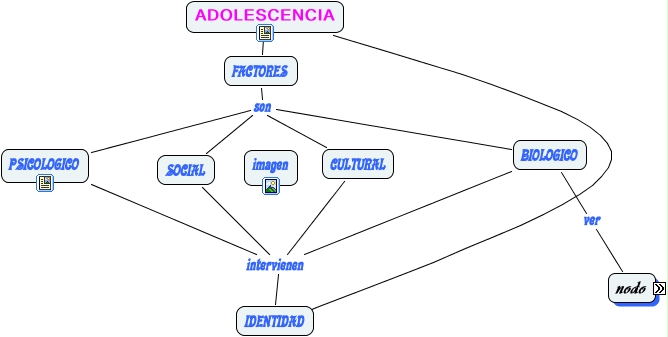 Este Cmap, tiene información relacionada con: adolescencia, FACTORES son CULTURAL, CULTURAL intervienen BIOLOGICO, CULTURAL intervienen SOCIAL, CULTURAL intervienen IDENTIDAD, BIOLOGICO son CULTURAL, ADOLESCENCIA ???? FACTORES, nodo ver BIOLOGICO, BIOLOGICO son PSICOLOGICO, FACTORES son PSICOLOGICO, BIOLOGICO son SOCIAL, FACTORES son SOCIAL, CULTURAL intervienen PSICOLOGICO, ADOLESCENCIA ???? IDENTIDAD