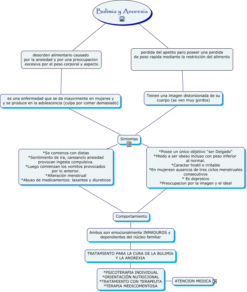 Este Cmap, tiene información relacionada con: bulimia, es una enfermedad que se da mayormente en mujeres y y se produce en la adolescencia (culpa por comer demasiado) ???? Sintomas, Bulimia y Anorexia ???? perdida del apetito paro poseer una perdida de peso rapida mediante la restricción del alimento, *Se comienza con dietas *Sentimiento de ira, cansancio ansiedad provocan ingesta compulsiva. *Luego comienzan los vomitos provocados por lo anterior. *Alteración menstrual *Abuso de medicamentos: laxantes y diureticos ???? Comportamiento, desorden alimentario causado por la ansiedad y por una preocupacion excesiva por el peso corporal y aspecto ???? es una enfermedad que se da mayormente en mujeres y y se produce en la adolescencia (culpa por comer demasiado), perdida del apetito paro poseer una perdida de peso rapida mediante la restricción del alimento ???? Tienen una imagen distorsionada de su cuerpo (se ven muy gordos), Sintomas ???? *Se comienza con dietas *Sentimiento de ira, cansancio ansiedad provocan ingesta compulsiva. *Luego comienzan los vomitos provocados por lo anterior. *Alteración menstrual *Abuso de medicamentos: laxantes y diureticos, Bulimia y Anorexia ???? desorden alimentario causado por la ansiedad y por una preocupacion excesiva por el peso corporal y aspecto, ATENCION MEDICA ???? *PSICOTERAPIA INDIVIDUAL *ORIENTACIÓN NUTRICIONAL *TRATAMIENTO CON TERAPEUTA *TERAPIA MEDICOMENTOSA, Sintomas ???? *Posee un único objetivo "ser Delgado" *Miedo a ser obeso incluso con peso inferior al normal. *Caracter hostil e irritable *En mujeresn ausencia de tres ciclos menstruales consecutivos * Es depresivo *Preocupacion por la imagen y el ideal, Comportamiento ???? *Posee un único objetivo "ser Delgado" *Miedo a ser obeso incluso con peso inferior al normal. *Caracter hostil e irritable *En mujeresn ausencia de tres ciclos menstruales consecutivos * Es depresivo *Preocupacion por la imagen y el ideal, TRATAMIENTO PARA LA CURA DE LA BULIMIA Y LA ANOREXIA ???? *PSICOTERAPIA INDIVIDUAL *ORIENTACIÓN NUTRICIONAL *TRATAMIENTO CON TERAPEUTA *TERAPIA MEDICOMENTOSA, Ambos son emocionalmente INMADUROS y dependientes del núcleo familiar ???? TRATAMIENTO PARA LA CURA DE LA BULIMIA Y LA ANOREXIA, Comportamiento ???? Ambos son emocionalmente INMADUROS y dependientes del núcleo familiar, Tienen una imagen distorsionada de su cuerpo (se ven muy gordos) ???? Sintomas