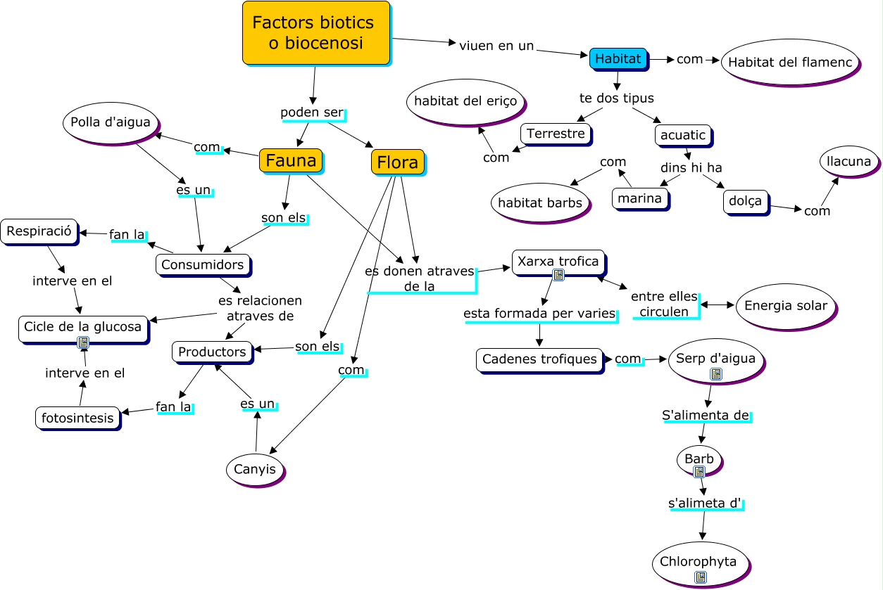 Este Cmap, tiene información relacionada con: factors biotics, Consumidors es relacionen atraves de Cicle de la glucosa, Xarxa trofica entre elles circulen Energia solar, Serp d'aigua S'alimenta de Barb, Canyis es un Productors, Flora es donen atraves de la Xarxa trofica, acuatic dins hi ha marina, Fauna son els Consumidors, Cadenes trofiques com Serp d'aigua, Flora son els Productors, Consumidors es relacionen atraves de Productors, Factors biotics o biocenosi viuen en un Habitat, Fauna es donen atraves de la Xarxa trofica, Polla d'aigua es un Consumidors, marina com habitat barbs, Habitat te dos tipus Terrestre, Flora com Canyis, Factors biotics o biocenosi poden ser Fauna, Consumidors fan la Respiració, Habitat te dos tipus acuatic, acuatic dins hi ha dolça